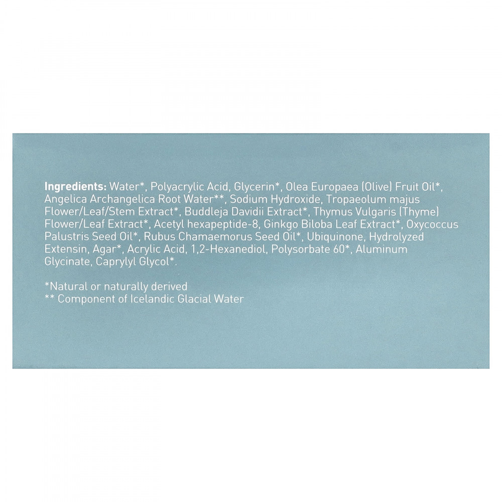 Вода*, полиакриловая кислота, глицерин*, оливковое масло (Olea europaea)*, вода из корня дудника дудника (Angelica)**, гидроксид натрия, экстракт цветков, листьев и стеблей тропаола (Tropaeolum majus)*, экстракт буддлеи Давида*, экстракт цветков и листьев чабреца (Thymus vulgaris)*, ацетил гексапептид-8, экстракт листьев гинкго билоба*, масло из семян орегано (Oxycoccus palustris)*, масло из семян малины (Rubus chamaemorus)*, убихинон, гидролизованный экстенсин, агар*, акриловая кислота, 1,2-гександиол, полисорбат 60*, глицинат алюминия, каприлилгликоль*.