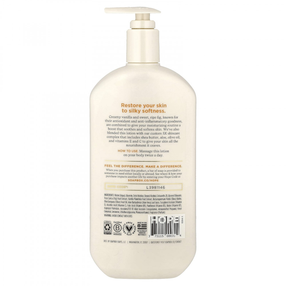 Сливочная ваниль и сладкий спелый инжир, известные своими антиоксидантными и противовоспалительными свойствами, сочетаются с другими ингредиентами, которые успокаивают и смягчают кожу. Кроме того, мы смешали этот лосьон с нашим специальным комплексом для ухода за кожей 5X, который включает масло ши, алоэ, оливковое масло и витамины E и C, чтобы обеспечить вашей коже все необходимое для питания.