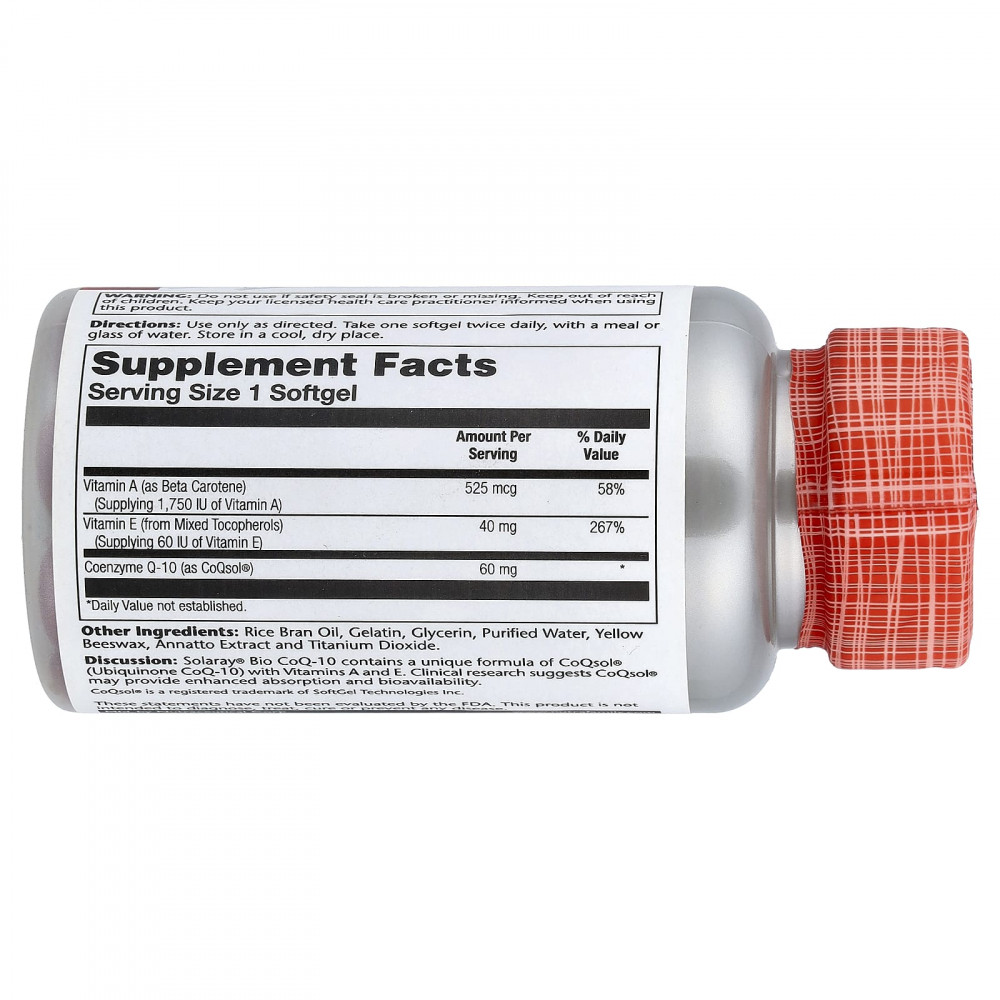 Solaray® Bio CoQ-10 содержит уникальную формулу CoQsol® (убихинон CoQ-10) с витаминами A и E. Клинические исследования показывают, что CoQsol® может обеспечивать улучшенное усвоение и биодоступность.