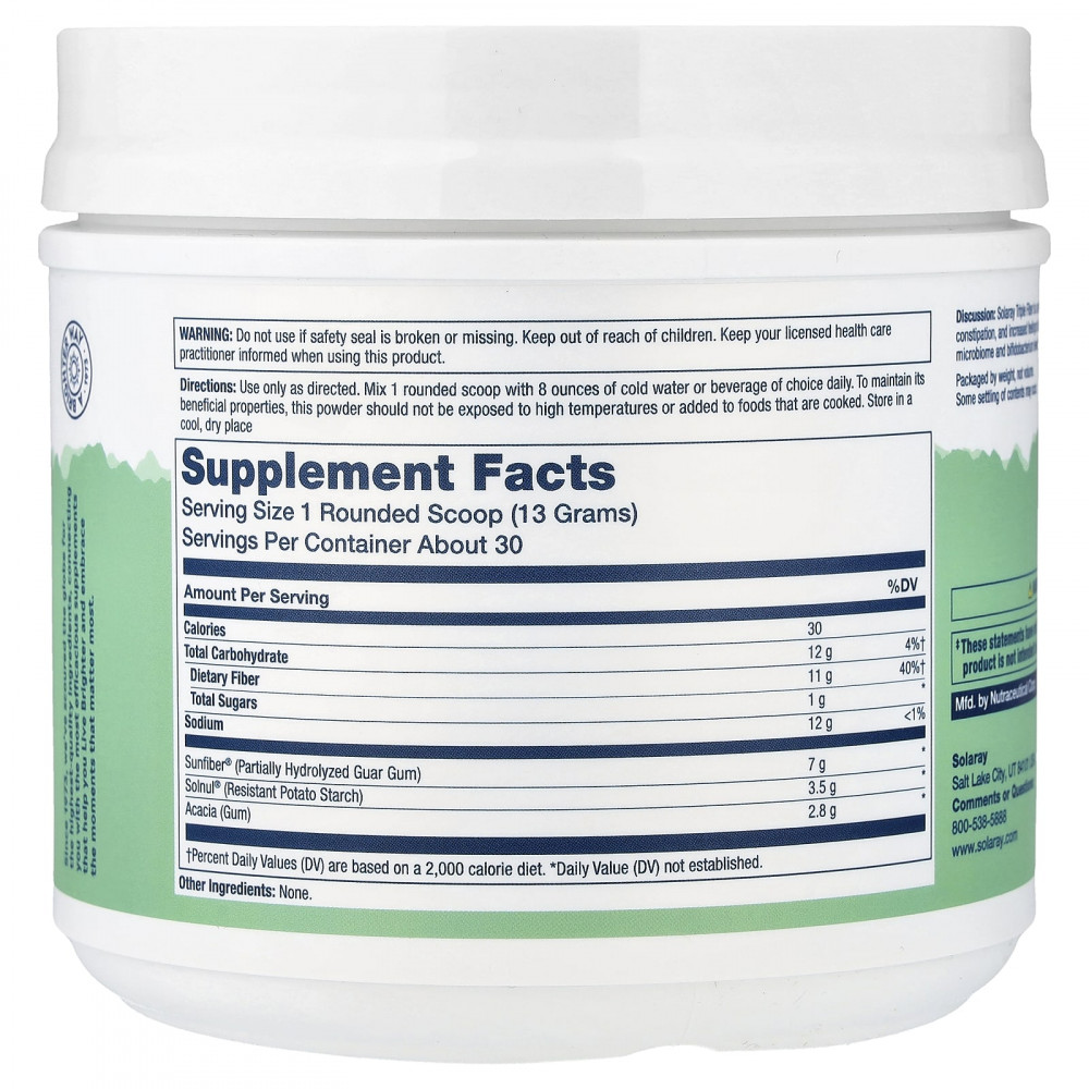 Описание. Solaray Triple Fiber — это уникальная смесь трех видов клетчатки, которые вместе обеспечивают регулярность стула, периодические запоры и повышенное чувство сытости. Доказано, что ингредиенты в этой формуле поддерживают здоровый микробиом и уровень бифидобактерий.