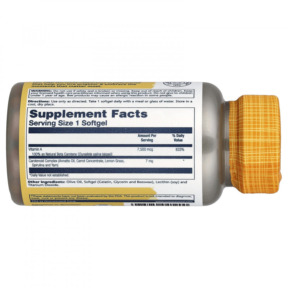 | Витамин А 100% в виде натурального бета-каротина [Dunaliella Salina (водоросли)] | 7500 мкг | 833% |