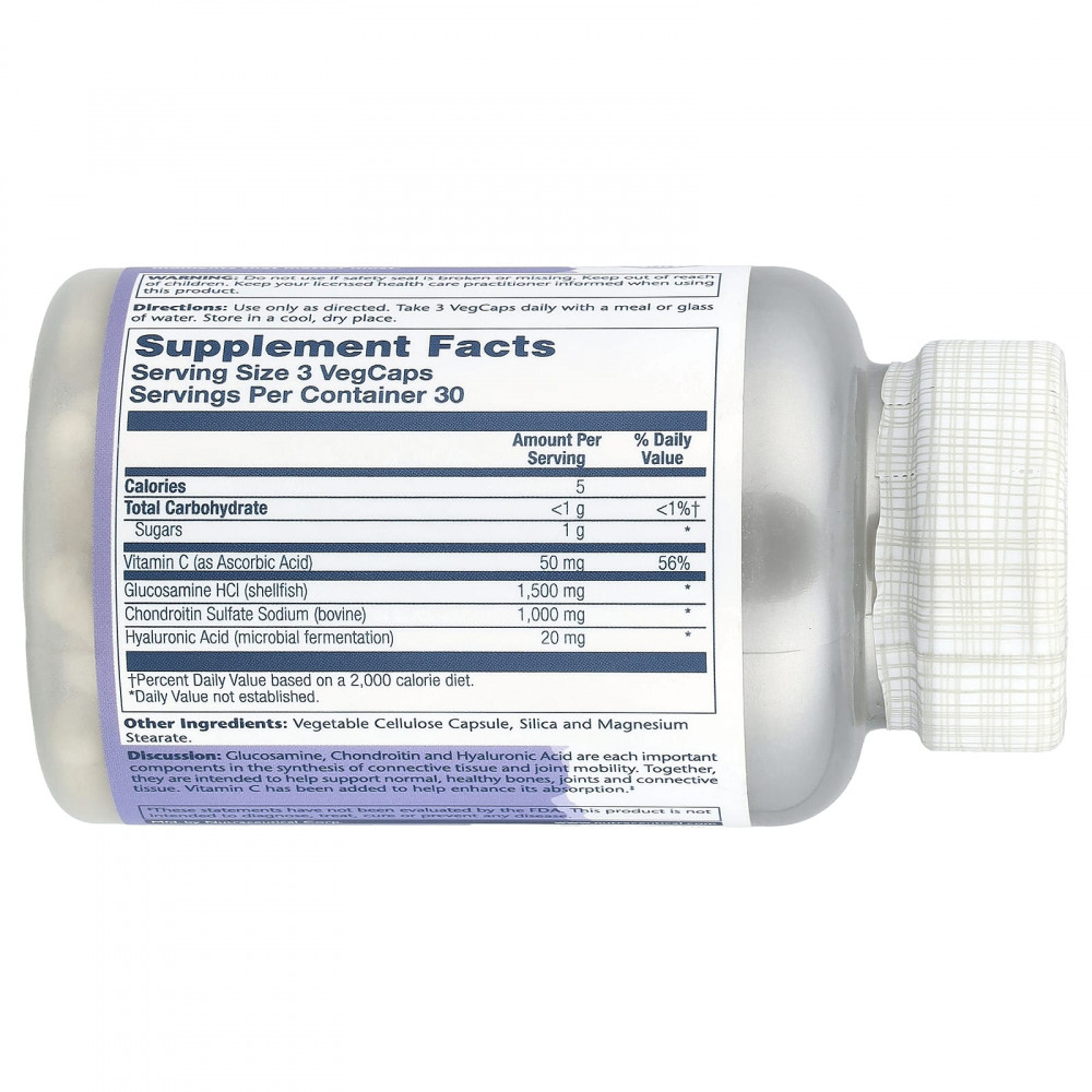 Описание. Глюкозамин, хондроитин и гиалуроновая кислота являются важными компонентами синтеза соединительной ткани и подвижности суставов. Вместе они предназначены для поддержания нормального здоровья костей, суставов и соединительной ткани. Витамин С добавлен для улучшения его усвоения.