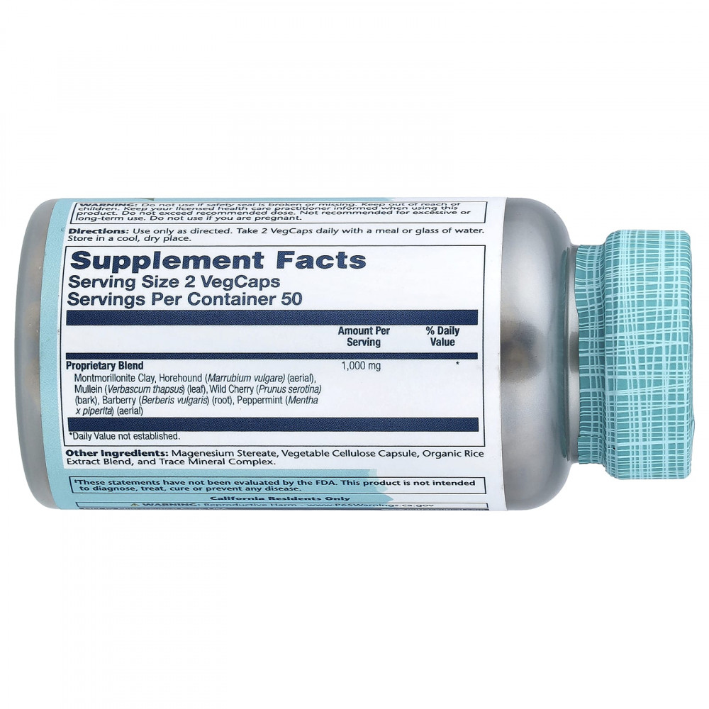 | Запатентованная смесь Монтмориллонитовая глина, борзая (Marrubium vulgare) (надземный), коровяк (Verbascum thapsus) (лист), дикая вишня (Prunus serotina) (кора), барбарис (Berberis vulgaris) (корень), перечная мята (Mentha x piperita) (надземная часть) | 1000 мг | * |