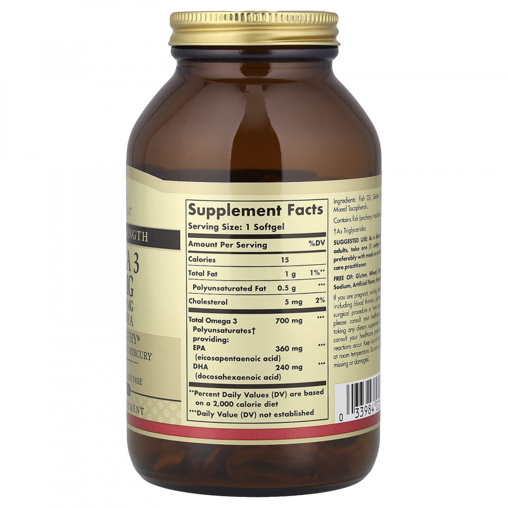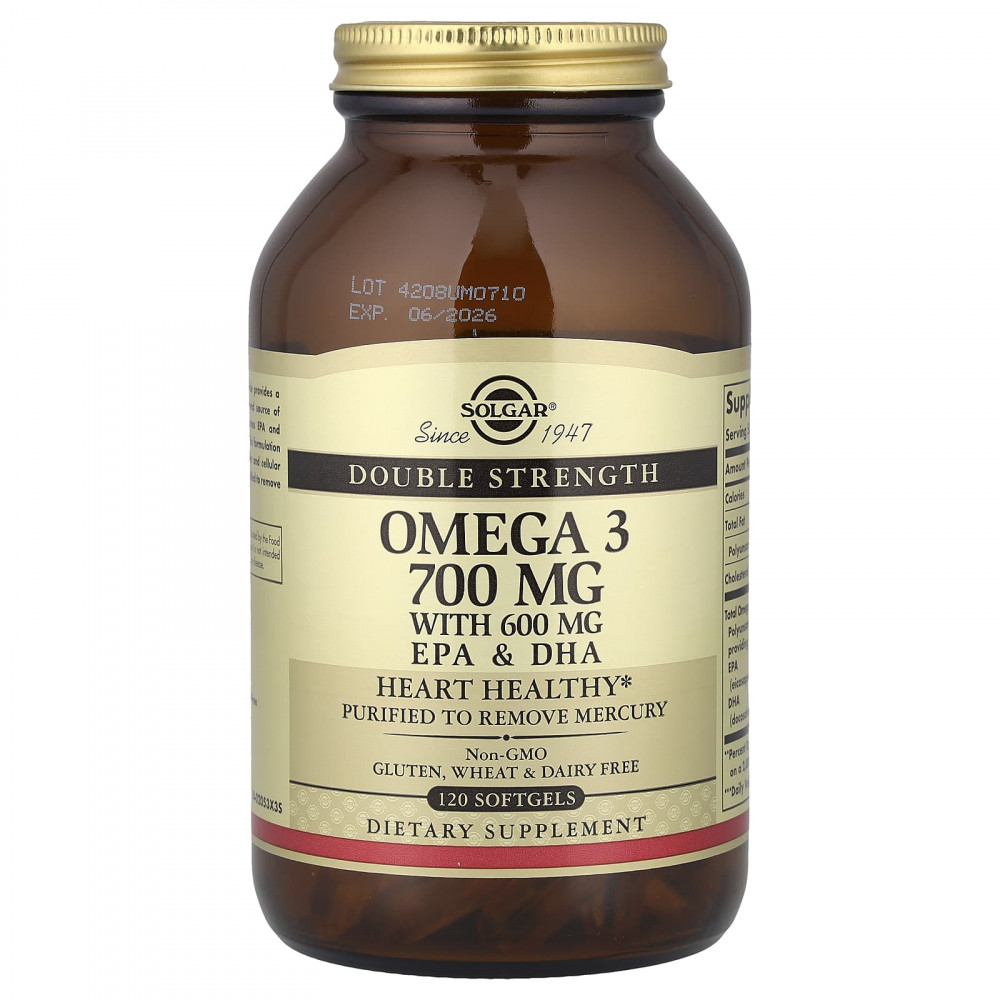 Омега-3 (700 мг) в форме триглицеридов — это натуральный концентрированный источник омега-3 полиненасыщенных кислот ЭПК и ДГК, полученных из холодноводной рыбы. Данная добавка помогает поддерживать здоровье сердечно-сосудистой системы, суставов и клеток. Продукт подвергается молекулярной дистилляции для очищения от ртути.