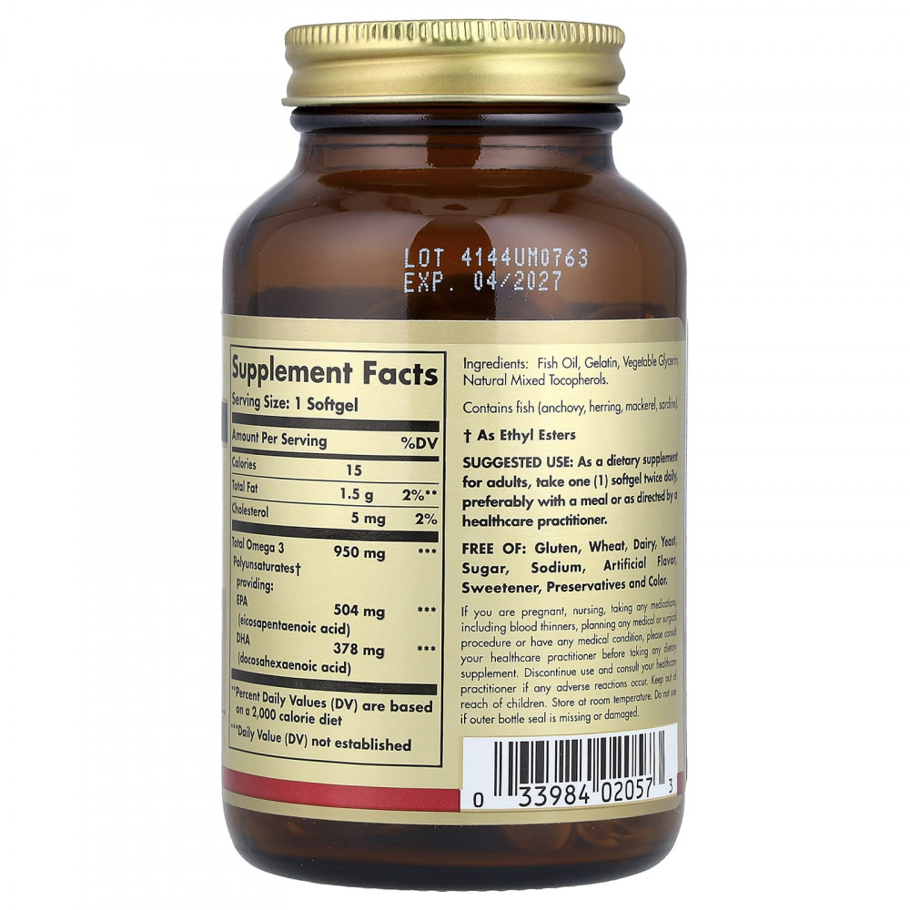 Омега-3 (950 мг) — это самая высокая концентрация натуральных полиненасыщенных кислот омега-3 ЭПК и ДГК от Solgar, полученных из холодноводной рыбы. Данная формула поддерживает здоровье сердечно-сосудистой системы, суставов и кожи. Продукт подвергается молекулярной дистилляции для очищения от ртути.