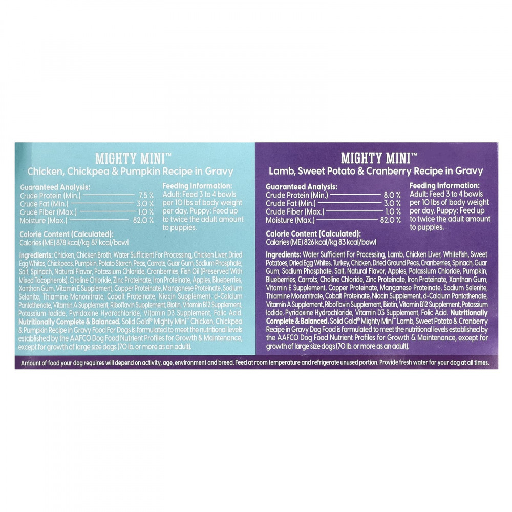 Питательный комплекс Сбалансированный. Цыпленок Mighty Mini ™ от Solid Gold®, Нут Рецепт тыквы в подливке для собак разработан с учетом уровней питательных веществ, установленных в корме для собак AAFCO. Nutrient Profiles for Growth & amp; Обслуживание, за исключением собак большого размера (70 фунтов и более во взрослом возрасте).