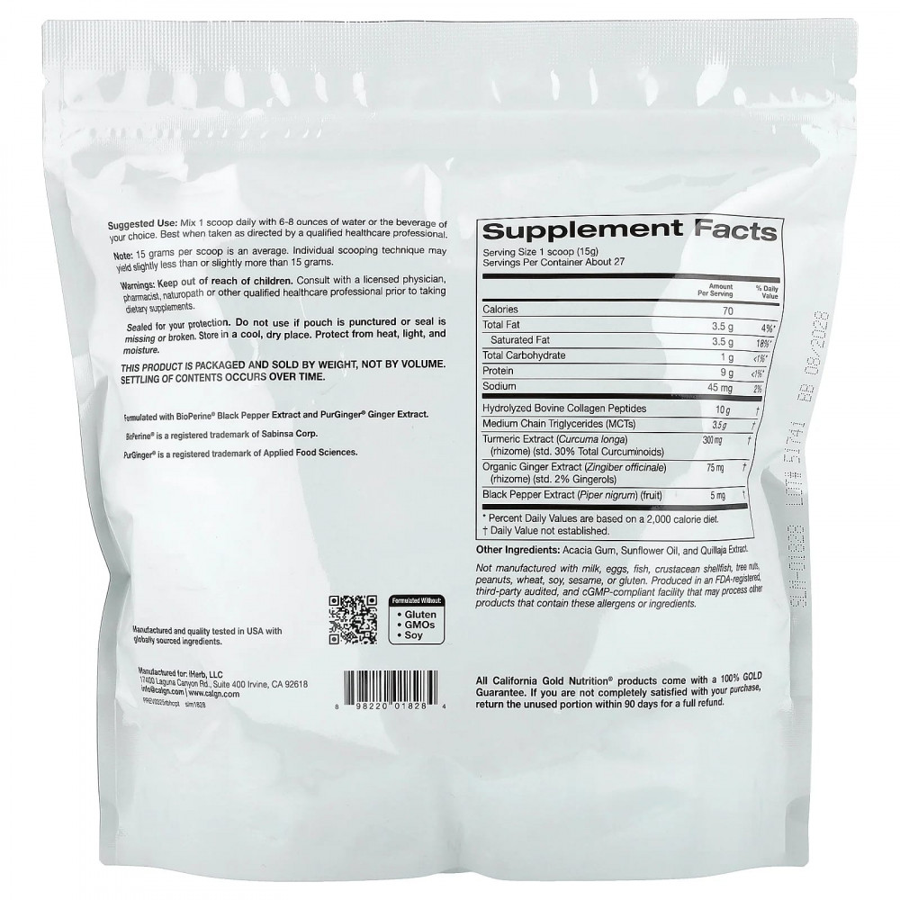Пептиды гидролизованного коллагена от California Gold Nutrition® сочетают в себе силу коллагена, куркумы, MCT и имбиря, чтобы обеспечить множество преимуществ в одной удобной добавке.