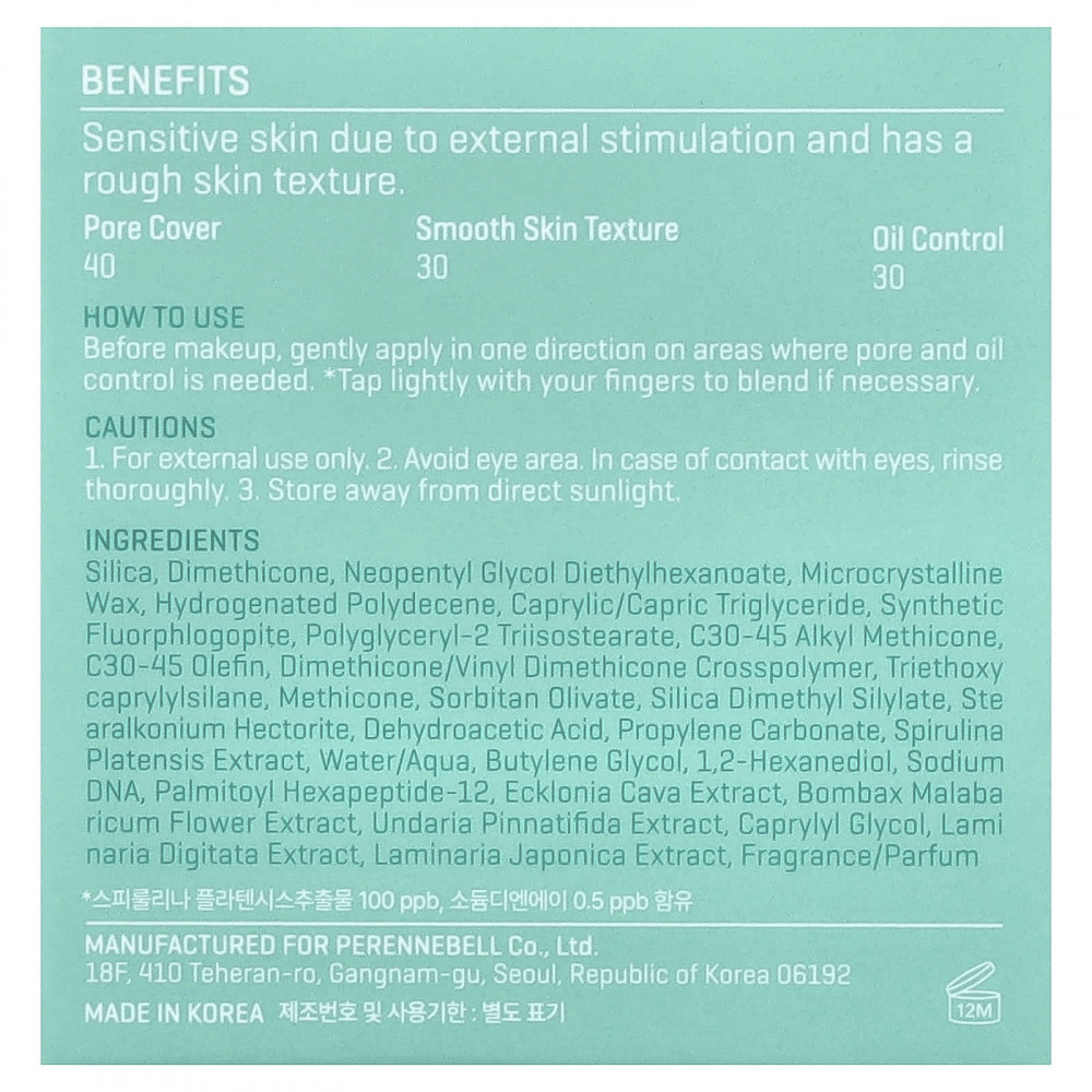 Диоксид кремния, диметикон, неопентилгликоль диэтилгексаноат, микрокристаллический воск, гидрогенизированный полидецен, каприловый/каприновый триглицерид, синтетический фторфлогопит, полиглицерил-2 триизостеарат, c30-45 алкил метикон, олефин c30-45, диметикон/винил диметикон кроссполимер, триэтоксикаприлилсилан, метикон, сорбитан оливат, диметил силилат диоксида кремния, стеаралкония гекторит, дегидроуксусная кислота, пропиленкарбонат, экстракт спирулины (Spirulina platensis), вода/аква, бутиленгликоль, 1,2-гександиол, ДНК натрия, пальмитоил гексапептид-12, экстракт водоросли эклонии кавы (Ecklonia cava), экстракт цветков ромашки (Bombax malabaricum), экстракт ундарии перистой (Undaria pinnatifida), каприлилгликоль, экстракт ламинарии пальчаторассеченной (Laminaria digitata), экстракт ламинарии японской (Laminaria japonica), отдушка/парфюмерная композиция.