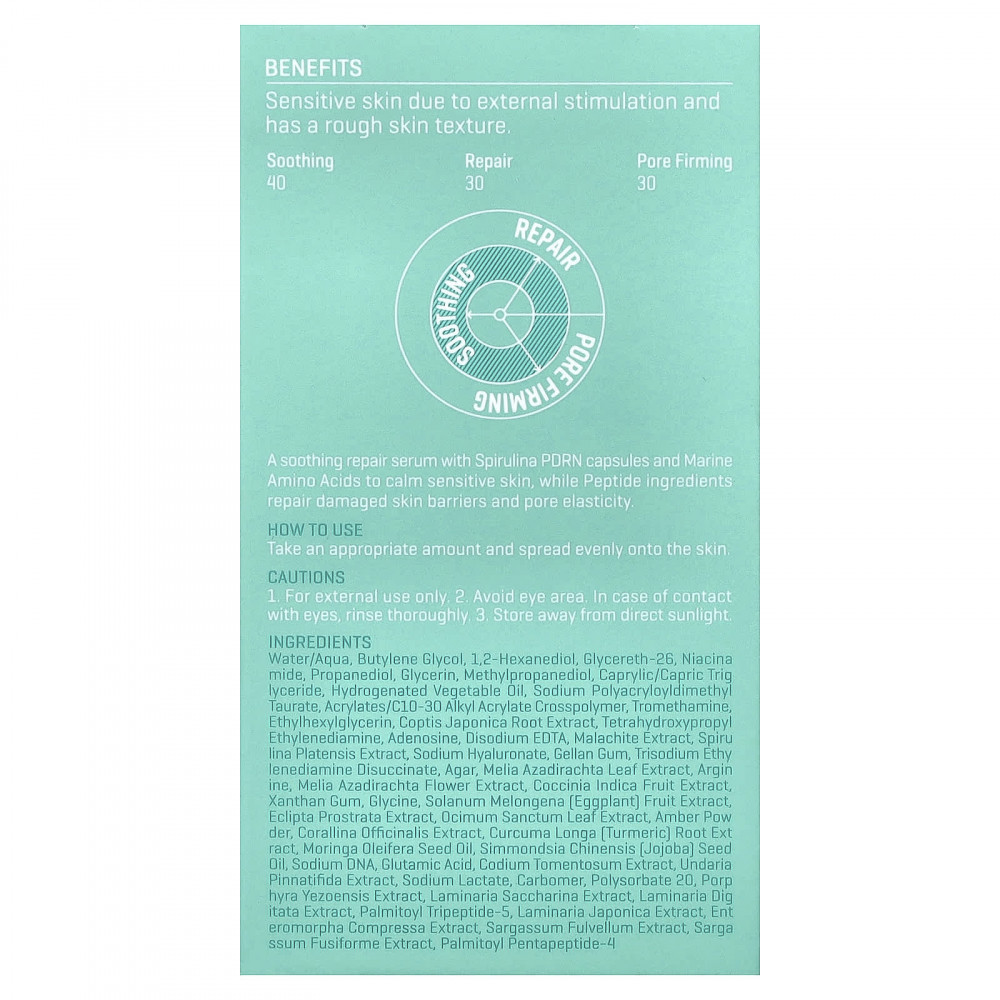 Успокаивающая восстанавливающая сыворотка со спирулиной, капсулами и морскими аминокислотами успокаивает чувствительную кожу, а пептидные ингредиенты восстанавливают поврежденные кожные барьеры и эластичность пор.