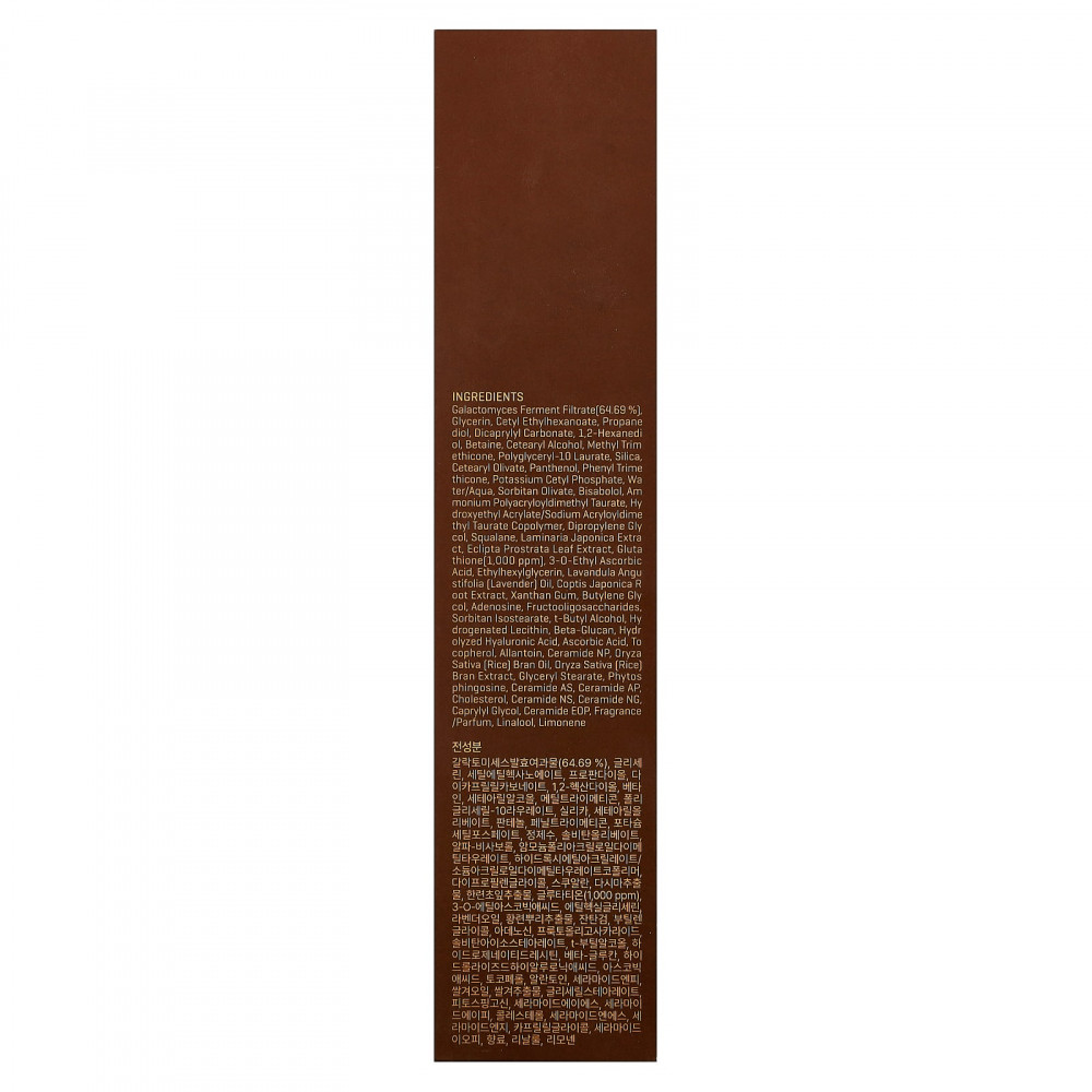 Фильтрат фермента Galactomyces [64,69%), глицерин, цетилэтилгексаноат, пропандиол, дикаприлил карбонат, 1,2-гександиол, бетаин, цетеариловый спирт, метилтриметикон, полиглицерил-10 лаурат, диоксид кремния, цетеарил оливат, пантенол, фенилтриметикон, цетил фосфат калия, вода / вода, сорбитан оливат, бисаболол, полиакрилоилдиметилтаурат аммония, гидроксиэтил акрилат/натрия акрилоилдиметилтаурата сополимер, дипропиленгликоль, сквалан, экстракт ламинарии японской (Laminaria japonica), экстракт листьев эклипты простертой (Eclipta prostrata), глутатион [1000 част. / млн], 3-0-этил аскорбиновая кислота, этилгексилглицерин, лавандовое масло (Lavandula angustifolia), экстракт корня коптиса японского (Coptis japonica), ксантановая камедь, бутиленгликоль, аденозин, фруктоолигосахариды, сорбитан изостеарат, т-бутиловый спирт, гидрогенизированный лецитин, бета-глюкан, гидролизованная гиалуроновая кислота, аскорбиновая кислота, токоферол, аллантоин, керамид NP, масло из рисовых отрубей (Oryza sativa), экстракт рисовых отрубей (Oryza sativa), глицерил стеарат, фитосфингозин, керамид в виде, керамид АP, холестерина, керамид нс, керамид нг, каприлилгликоль, керамид EOP, отдушка / парфюмерия, линалоол, лимонен.