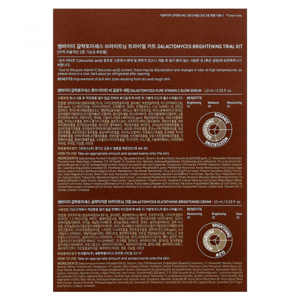 Сыворотка для сияния с чистым витамином C Galactomyces: Фильтрат фермента Galactomyces (75%), дипропиленгликоль, глицерин, бутиленгликоль, аскорбиновая кислота (30 000 част./млн), 1,2-гександиол, никотинамид, трометамин, вода / вода, трегалоза, с12-14 парет-12, ксантановая камедь, аллантоин, гидроксиэтилцеллюлоза, этилгексилглицерин, аденозин, масло из плодов бергамота [Citrus aurantium bergamia], гидрогенизированный лецитин, сополимер глицерил акрилата/акриловой кислоты, полиглицерил-10 стеарат, ПВМ/МА сополимер, гиалуронат натрия, лавандовое масло (Lavandula angustifolia), пантенол, аскорбил фосфат натрия (25 част./млн), фенилэтил резорцин, экстракт ягод черноплодной рябины (Aronia melanocarpa), экстракт ройбуша (Aspalathus linearis), экстракт бамбука (Bambusa vulgaris), мальтодекстрин, сахарида гидролизат, экстракт плодов инжира (Ficus carica), экстракт плодов Phoenix dactylifera [финик], экстракт белого трюфеля (Tuber magnatum), биотин, фолиевая кислота, экстракт хауттюйнии (Houttuynia cordata), пиридоксин, экстракт плодов опунции кошениленосной (Opuntia coccinellifera), экстракт стеблей опунции индийской (Opuntia ficus-indica), каприловый/каприновый триглицерид, экстракт семян баобаба (Adansonia digitata), лейконосток/ферментированный фильтрат корня редиса, экстракт брокколи (Brassica oleracea italica), экстракт цветков календулы (Calendula officinalis), экстракт спарассиса курчавого (Sparassis crispa), цианокобаламин, экстракт прополиса, токоферол, экстракт ягод асаи (Euterpe oleracea), экстракт ягод черной смородины (Ribes nigrum), экстракт ягод ежевики (Rubus fructicosus), экстракт ягод малины (Rubus idaeus), экстракт ягод голубики (Vaccinium angustifolium), экстракт ягод клюквы (Vaccinium macrocarpon), экстракт ягод черники (Vaccinium myrtillus), экстракт спирулины (Spirulina maxima), астаксантин, инозитол, линолевая кислота, тиамина гидрохлорид, карамель, линалоол, лимонен.