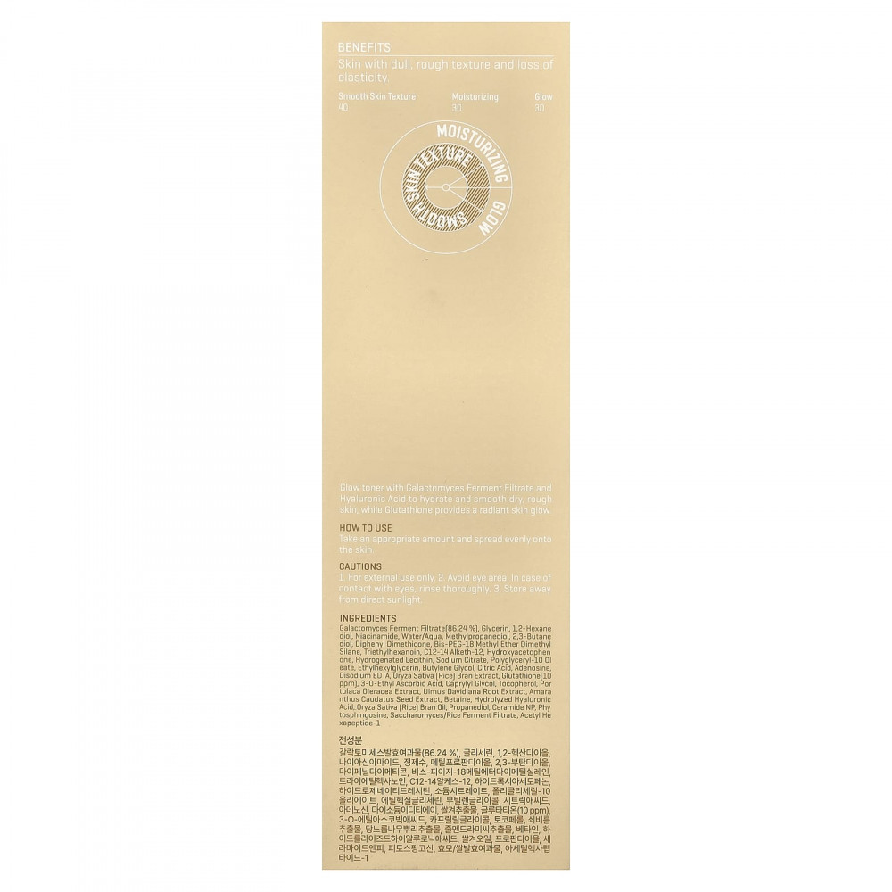 Тонер для сияния с фильтратом фермента галактомицетов и гиалуроновой кислотой для увлажнения и разглаживания сухой, огрубевшей кожи, а глутатион придает коже сияние.
