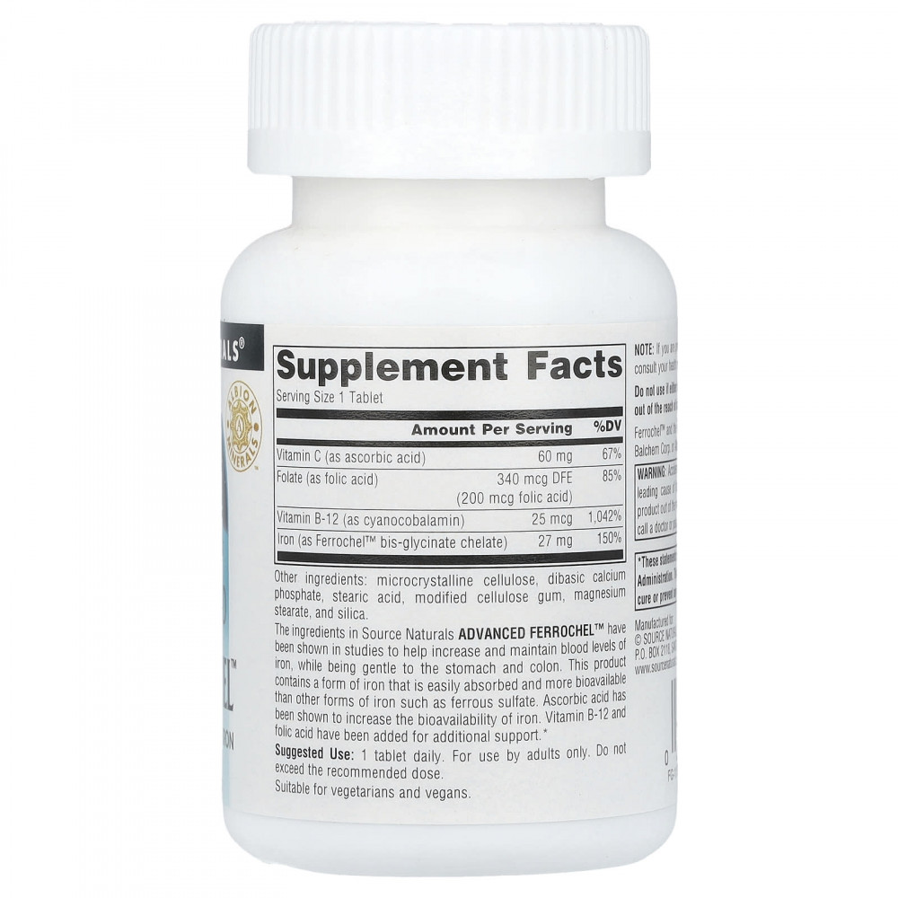 В исследованиях было показано, что ингредиенты Source Naturals Advanced Ferrochel™ помогают повысить и поддерживать уровень железа в крови, при этом бережно воздействуя на желудок и толстую кишку. Этот продукт содержит форму железа, которая легко усваивается и более биодоступна, чем другие формы железа, например сульфат железа. Доказано, что аскорбиновая кислота повышает биодоступность железа. Для дополнительной поддержки добавлены витамин B12 и фолиевая кислота.