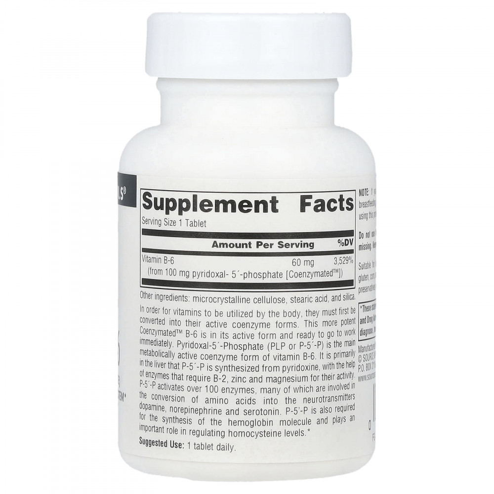 Для того чтобы витамины могли использоваться организмом, они сначала должны быть преобразованы в активные коферментные формы. Этот более эффективный витамин B6 Coenzymated™ находится в активной форме и готов к работе немедленно. Пиридоксаль-5'-фосфат (PLP или P-5'-P) — основная метаболически активная коферментная форма витамина B6. P-5'-P синтезируется из пиридоксина с помощью ферментов, которым для поддержания активности необходимы витамин B2, цинк и магний. P-5'-P активирует более 100 ферментов, многие из которых участвуют в преобразовании аминокислот в нейромедиаторы дофамин, норэпинефрин и серотонин. P-5'-P также необходим для синтеза молекулы гемоглобина и играет важную роль в регулировании уровня гомоцистеина.