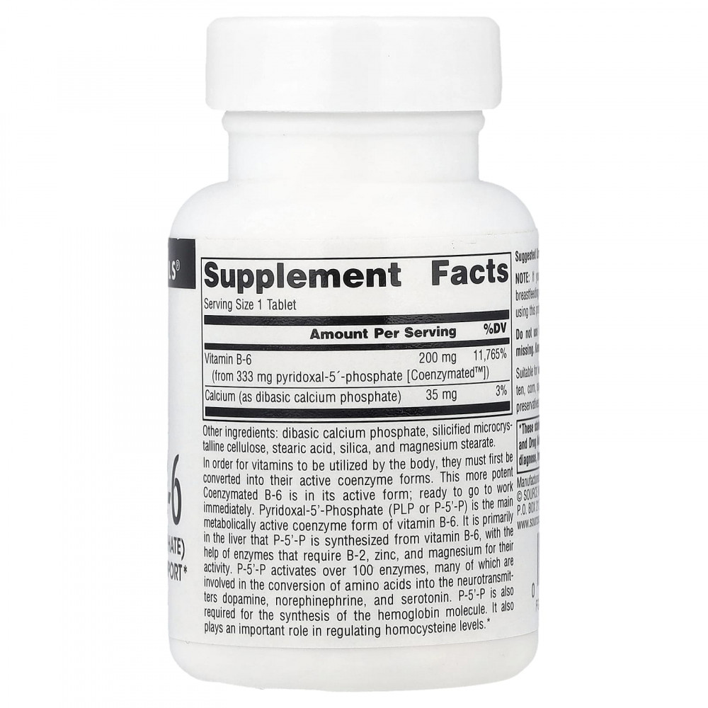 Для того чтобы витамины могли использоваться организмом, они сначала должны быть преобразованы в активные коферментные формы. Этот более эффективный коферментированный витамин B6 находится в активной форме; готовы к немедленной работе. Пиридоксаль-5'-фосфат (PLP или P-5'-P) — основная метаболически активная коферментная форма витамина B6. P-5'-P синтезируется в печени из витамина B6 с помощью ферментов, которым для поддержания активности необходимы витамин B2, цинк и магний. P-5'-P активирует более 100 ферментов, многие из которых участвуют в преобразовании аминокислот в нейромедиаторы дофамин, норэпинефрин и серотонин. P-5'-P также необходим для синтеза молекулы гемоглобина. Он также играет важную роль в регулировании уровня гомоцистеина.
