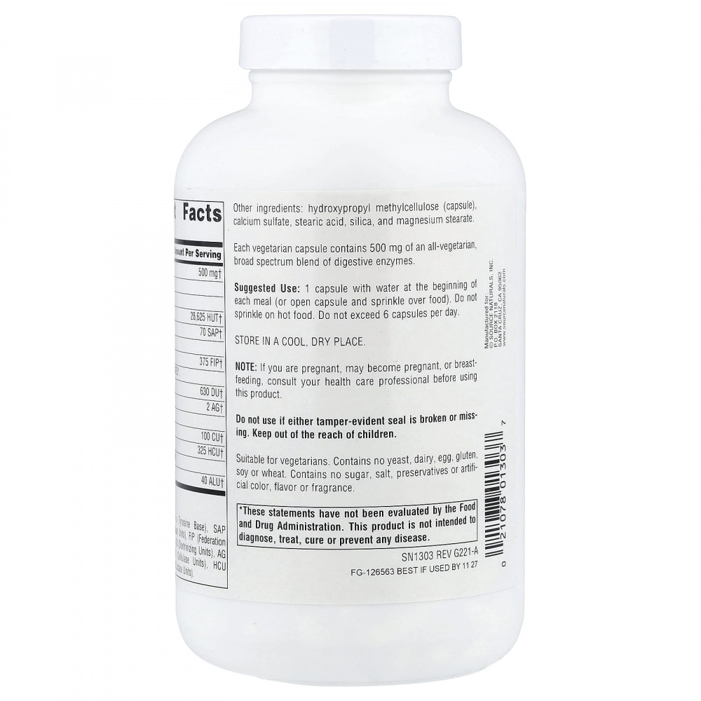 Каждая вегетарианская капсула содержит 500 мг полностью вегетарианского продукта., смеси пищеварительных ферментов широкого спектра.