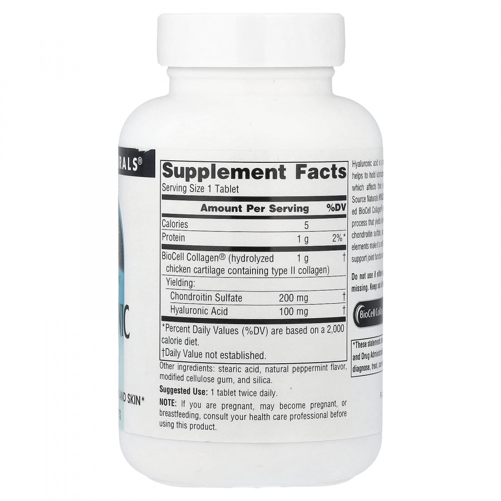 Гиалуроновая кислота - основной компонент ткани суставов. Она помогает удерживать влагу в суставах и хрящах, что влияет на их упругость, эластичность и силу. Гиалуроновая кислота Source Naturals производится из запатентованного BioCell Collagen®, который прошел процесс гидролиза, в результате которого получают гиалуроновую кислоту с низкой молекулярной массой, хондроитинсульфат и пептиды коллагена типа II. Эти элементы делают его комплексным ингредиентом, который помогает поддерживать работу суставов и здоровый внешний вид кожи.