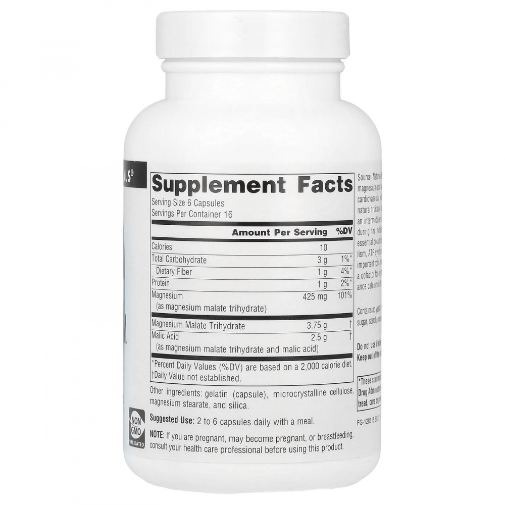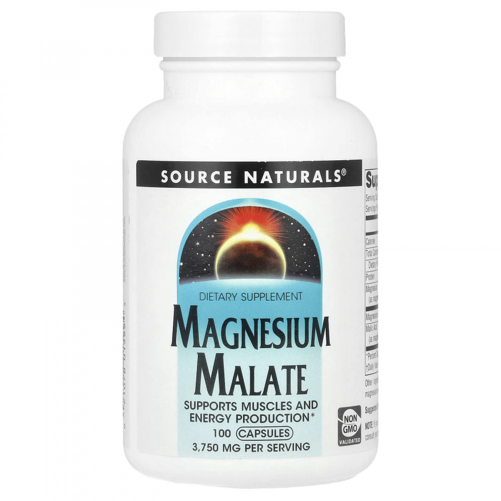 Малат магния Source Naturals - это соединение магния и яблочной кислоты. Он поддерживает правильную работу мышц, здоровье сердечно-сосудистой системы и выработку энергии. Яблочная кислота - это натуральная фруктовая кислота, которая присутствует в большинстве клеток организма и является промежуточным звеном в цикле Кребса, где энергия улавливается в процессе метаболизма углеводов и жиров. Магний является важным кофактором для более чем 300 ферментативных реакций в метаболизме, синтезе АТФ и выработке энергии. Магний играет важную роль в расслаблении мышц из-за своей функции кофактора ферментов и из-за его способности уравновешивать кальций в клетке.