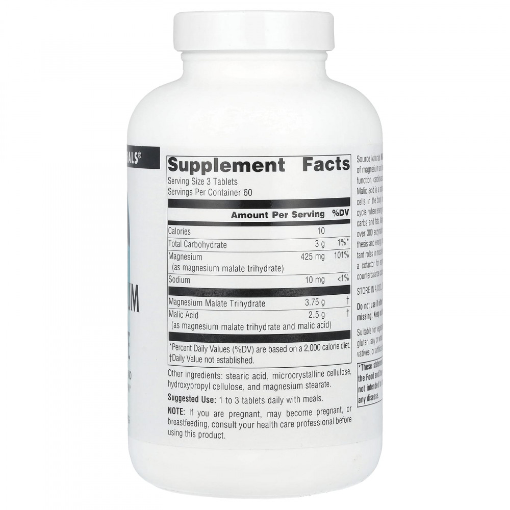 Малат магния от Source Naturals — это комплекс магния и яблочной кислоты. Он поддерживает мышечную функцию, здоровье сердечно-сосудистой системы и способствует выработке энергии. Яблочная кислота — натуральная фруктовая кислота, содержащаяся в большинстве клеток организма и участвующая в цикле Кребса, в котором энергия накапливается во время метаболизма углеводов и жиров. Магний — кофактор, необходимый для более чем 300 ферментных реакций метаболизма, синтеза АТФ и выработки энергии. Магний играет важную роль в расслаблении мышц, поскольку является кофактором ферментов, а также способен уравновешивать уровень кальция в клетках.