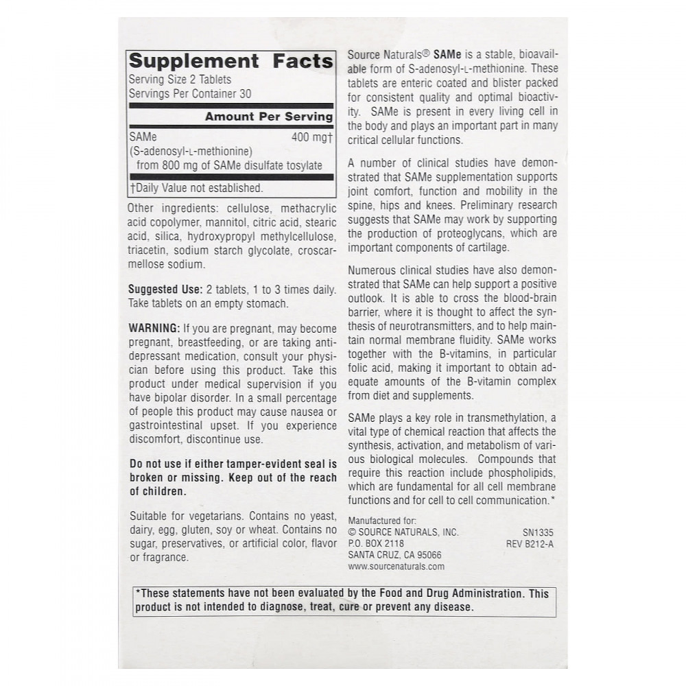 SAMe от Source Naturals® - это стабильная биодоступная форма S-аденозил-L-метионина. Эти таблетки имеют кишечнорастворимую оболочку и упакованы в блистеры для обеспечения стабильного качества и оптимальной биологической активности. SAMe присутствует в каждой живой клетке организма и играет важную роль во многих важных клеточных функциях.