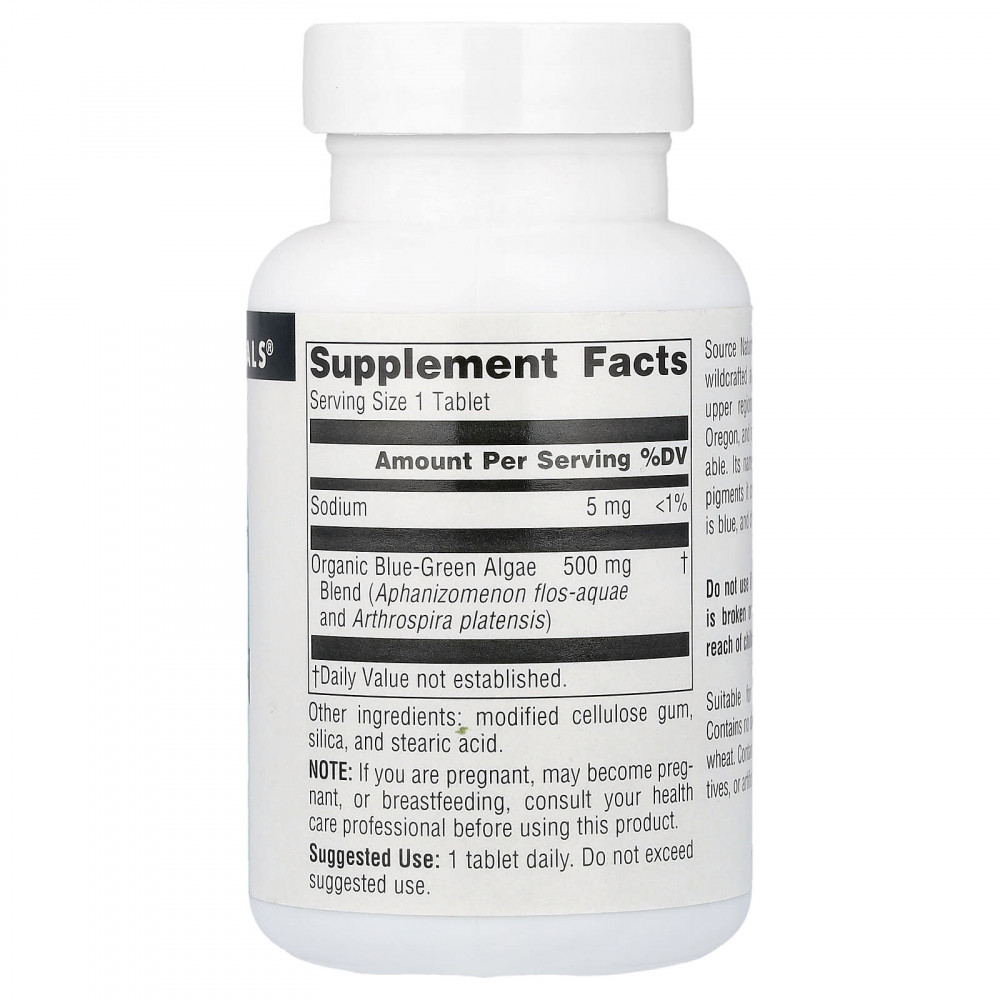Голубо-зеленые водоросли от Source Naturals выращиваются в дикой природе и собираются в главных регионах, расположенных в верхней части озера Аппер-Кламат, штат Орегон, и имеют высочайшее качество. Его название происходит от содержащихся в нем двух цветных пигментов: фикоцианина, окрашенного в синий цвет, и хлорофилла, окрашенного в зеленый цвет.
