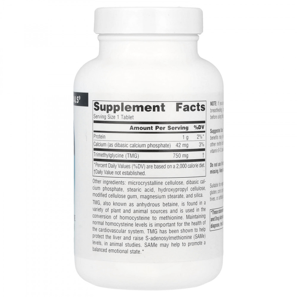 TMG, также известный как безводный бетаин, содержится в различных растительных и животных источниках и используется для преобразования гомоцистеина в метионин. Поддержание нормального уровня гомоцистеина важно для здоровья сердечно-сосудистой системы. Исследования на животных показали, что TMG помогает защитить печень и повышает уровень S-аденозилметионина (SAMe). SAMe может помочь сбалансировать эмоциональное состояние.