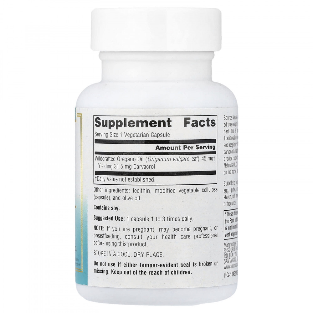 Масло орегано Source Naturals получено из листьев настоящего орегано в дикой природе (Origanum vulgare), ароматного растения, произрастающего в Средиземноморском регионе. Традиционно орегано используется для поддержания здоровья пищеварительной системы и дыхательных путей. Исследования в лабораторных условиях показывают, что карвакрол, активный компонент масла орегано, может поддерживать иммунную систему. МАСЛО ОРЕГАНО от Source Naturals — одно из самых эффективных масел на рынке. Оно стандартизировано до 70% карвакрола.