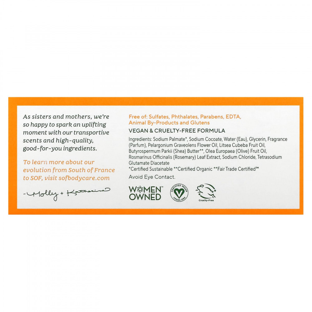 Наше полностью растительное мыло тройного измельчения по традиционному марсельскому рецепту образует роскошную пену и обеспечивает приятный уход и очищение. Увлажняющее кокосовое масло и экологичное пальмовое масло создают кремообразную пену, а питательный глицерин в сочетании с органическим маслом ши делает вашу кожу мягкой и увлажненной.