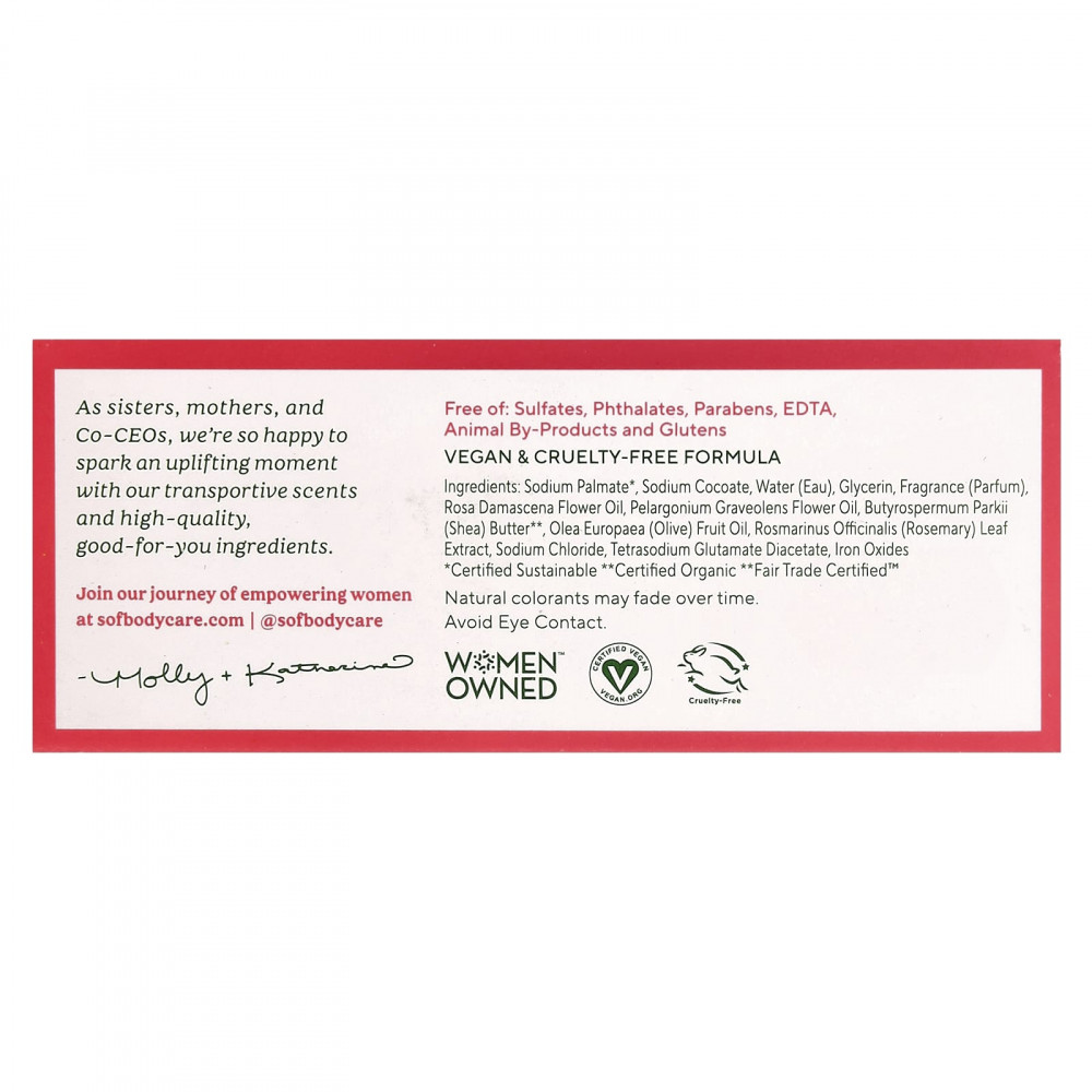 Пальмитат натрия*, кокоат натрия, вода (eau), глицерин, отдушка (парфюмерная композиция), масло из цветков дамасской розы, масло из цветков герани (Pelargonium graveolens), масло ши (Butyrospermum parkii) **, оливковое масло (Olea europaea), экстракт листьев розмарина (Rosmarinus officinalis), хлорид натрия, диацетат глутамата тетранатрия, оксиды железа.
