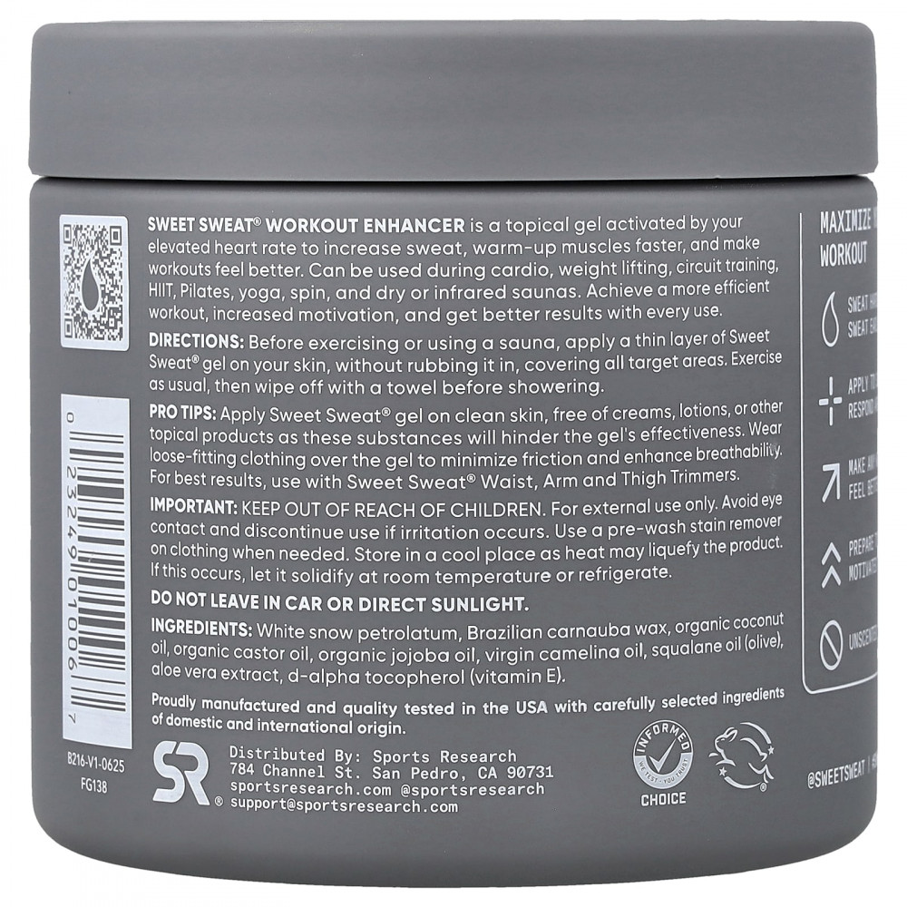 Средство для повышения эффективности тренировок Sweet Sweat® — это гель для наружного применения, который активируется при повышении пульса. Он усиливает потоотделение, быстрее разогревает мышцы и улучшает общее самочувствие во время занятий. Подходит для кардиотренировок, тяжелой атлетики, кругового тренинга, HIIT, пилатеса, йоги, сайклинга, а также для обычных и инфракрасных саун. Сделайте тренировку эффективнее, поднимите мотивацию и получайте лучшие результаты при каждом использовании.