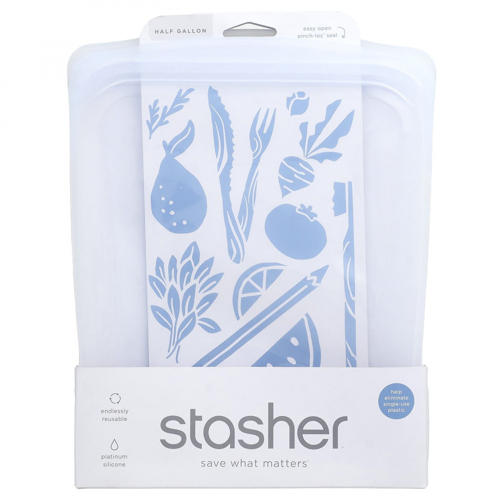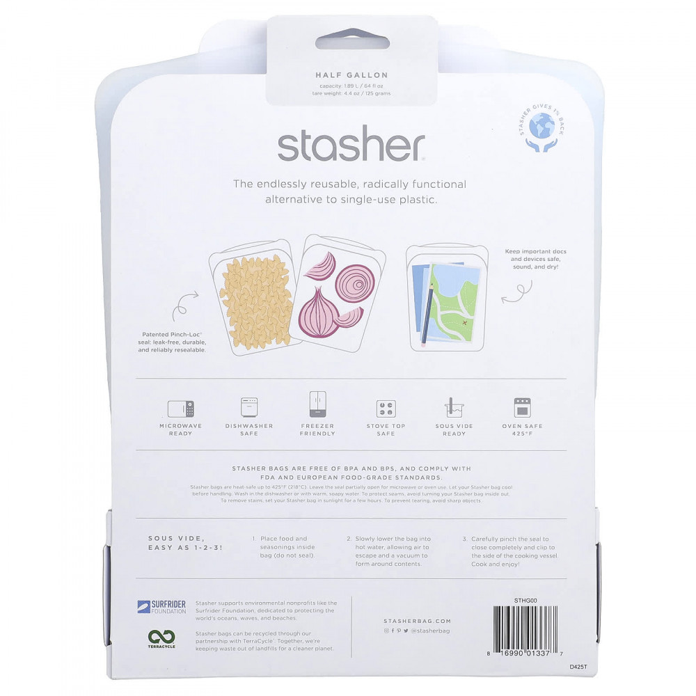 Не содержит пластика. Изготовленный из 100% чистого платинового силикона, контейнер Stasher не вызывает аллергических реакций и не содержит бисфенолы А и S, поэтому он безопасен для людей и нашей планеты. Он отвечает стандартам Управления по контролю за качеством пищевых продуктов и лекарственных препаратов, Европейским стандартам для хранения пищевых продуктов и не содержит наполнителей, или побочных продуктов.