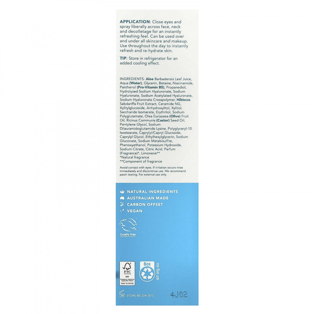 Разработано лабораторией Sukin из специально подобранных ингредиентов, включая про-B5, керамиды, экстракт австралийского гибискуса и алоэ вера. Этот туман уменьшает потерю влаги, успокаивает кожу и повышает ее увлажнение, сияние и защиту.