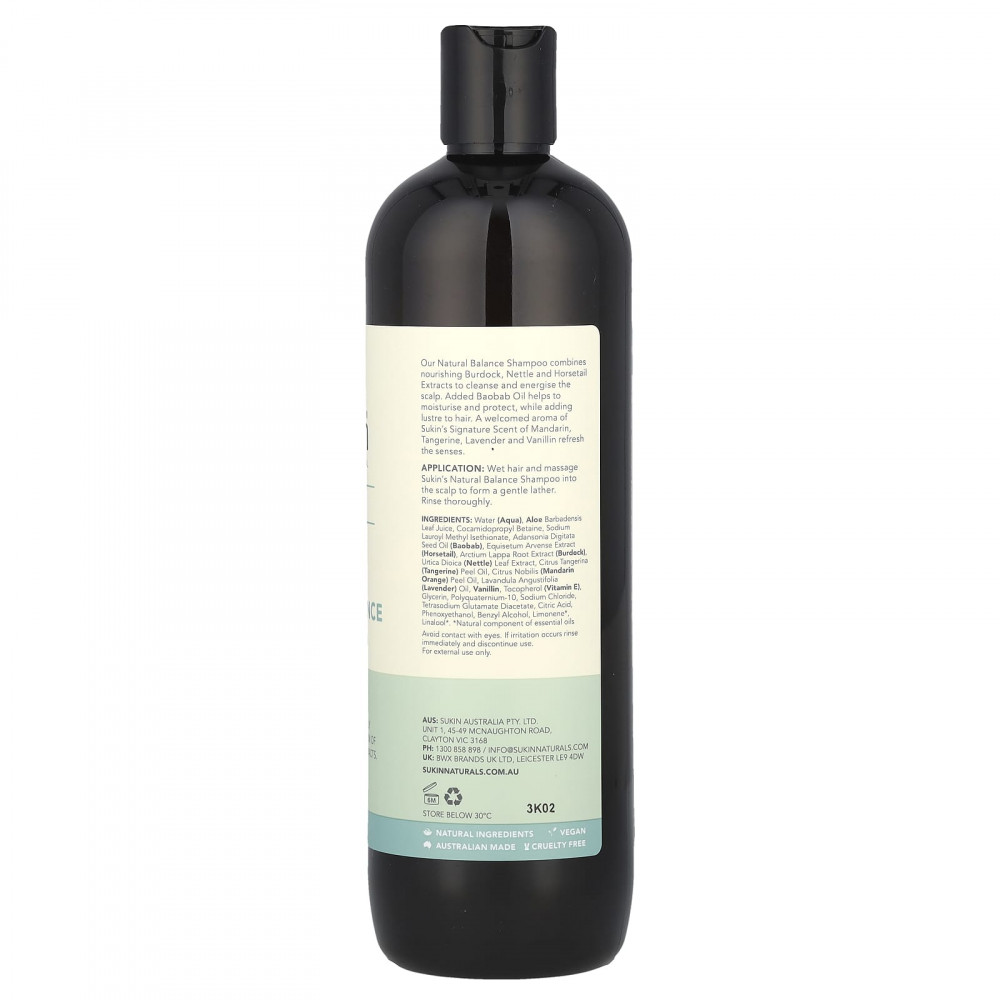 Наш шампунь для поддержания природного баланса сочетает в себе питательные экстракты лопуха, крапивы и хвоща для очищения и придания энергии коже головы. Добавленное масло баобаба помогает увлажнять и защищать волосы, придавая им блеск. Приятный фирменный аромат мандарина, лаванды и ванилина от Sukin освежает чувства.