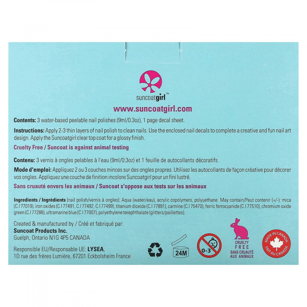 На чистые ногти нанесите 2–3 тонких слоя лака. Используйте прилагаемые наклейки для ногтей, чтобы завершить творческий и забавный дизайн ногтей. Нанесите прозрачный верхний слой Suncoatgirl для придания блеска.