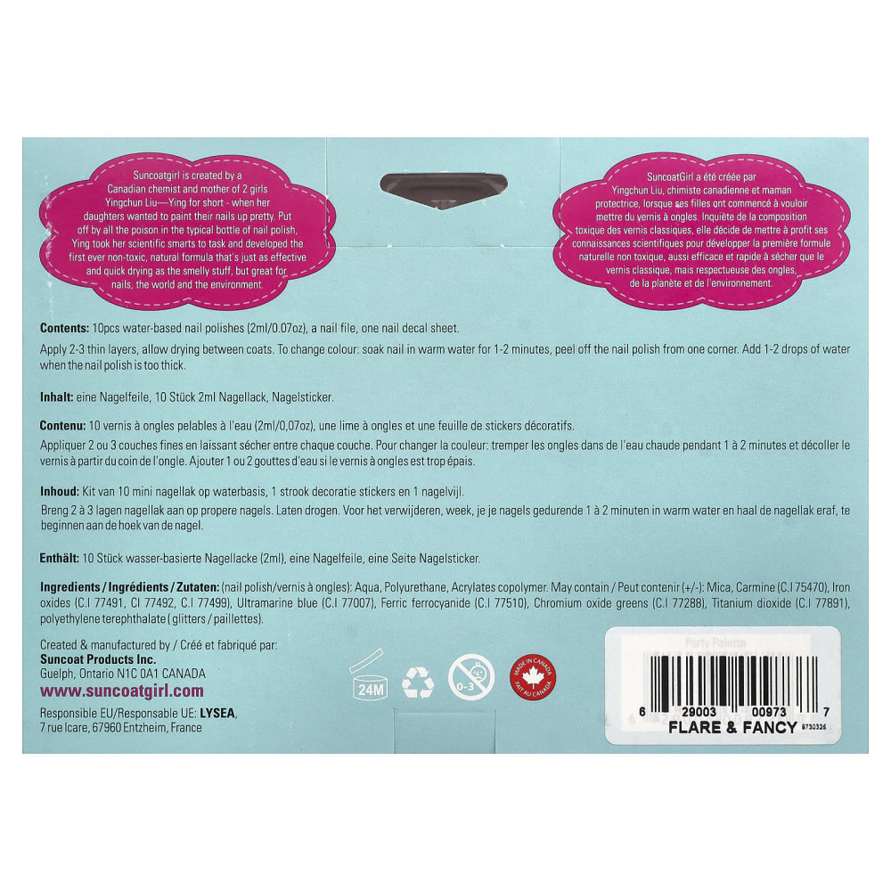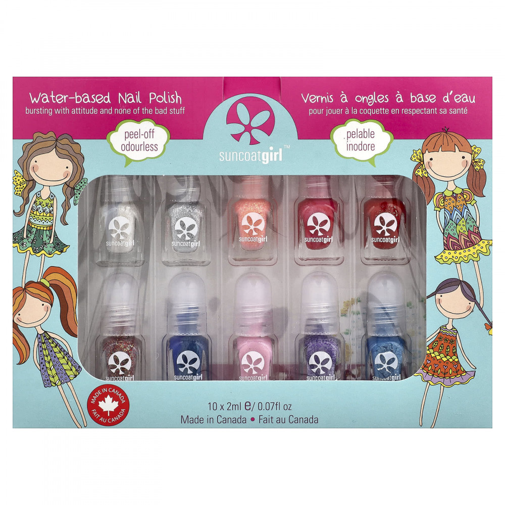 Содержимое упаковки: 10 лаков для ногтей на водной основе (2 мл/0,07 унции), пилочка для ногтей, один лист с декалями для ногтей.