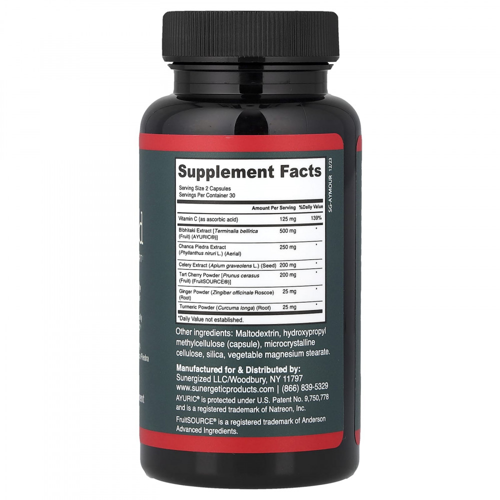 Содержит клинически изученный продукт Ayuric®: Наша эффективная добавка с мочевой кислотой содержит клинически изученное растение Ayuric®, древнее аюрведическое растение из плодовTerminalia bellerica, которое, как было доказано, помогает поддерживать здоровый уровень мочевой кислоты, уже находящийся в пределах нормы. Этот стандартизованный экстракт плодов бибхитаки (T. bellerica), на патент для которого подана заявка, является мощным растительным средством для поддержки уровня мочевой кислоты. Наша усовершенствованная добавка для поддержания уровня мочевой кислоты также содержит витамин C, обладающий антиоксидантной активностью, и смесь трав для поддержания общего хорошего самочувствия.