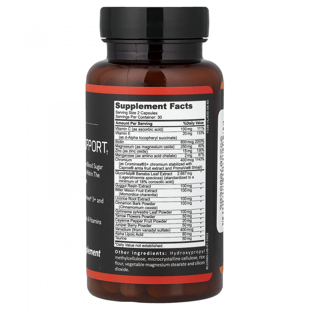 Наша добавка для поддержания уровня сахара в крови изготовлена из высококачественных трав и витаминов. Наши капсулы для поддержания уровня сахара в крови содержат более 15 ингредиентов, включая корицу, ванадий, хром, биотин и гуггул. Мы используем Glucohelp®, стандартизированный до 18% корсоловой кислоты, который помогает поддерживать уровень сахара в крови в пределах нормы. Эта уникальная смесь содержит большое количество трав и витаминов.