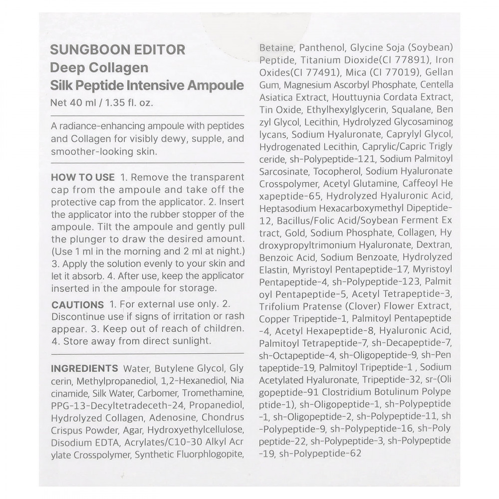 Вода, бутиленгликоль, глицерин, метилпропандиол, 1,2-гександиол, никотинамид, шелковая вода, карбомер, трометамин, ППГ-13-децилтетрадецет-24, пропандиол, гидролизованный коллаген, аденозин, порошок из ирландского мха (Chondrus crispus), агар, гидроксиэтилцеллюлоза, двунатриевая ЭДТК, акрилат/c10-30 алкил акрилат кроссполимер, синтетический фторфлогопит, бетаин, пантенол, пептид соевых бобов (Glycine soja), диоксид титана (CI 77891), оксиды железа (CI 77491), слюда (CI 77019), геллановая камедь, аскорбилфосфат магния, экстракт готу колы (Centella asiatica), экстракт хауттюйнии (Houttuynia cordata), оксид олова, этилгексилглицерин, сквалан, бензилгликоль, лецитин, гидролизованные гликозаминогликаны, гиалуронат натрия, каприлилгликоль, гидрогенизированный лецитин, каприловый/каприновый триглицерид, sh-полипептид-121, пальмитоил саркозинат натрия, токоферол, кроссполимер гиалуроната натрия, ацетил глютамин, кофеоил гексапептид-65, гидролизованная гиалуроновая кислота, гептанатрий гексакарбоксиметил дипептид-12, ферментированный экстракт палочковидной бактерии/фолиевой кислоты/соевых бобов, золото, фосфат натрия, коллаген, гиалуронат гидроксипропилтримония, декстран, бензойная кислота, бензоат натрия, гидролизованный эластин, миристоил пентапептид-17, миристоил пентапептид-4, sh-полипептид-123, пальмитоил пентапептид-5, ацетил тетрапептид-3, экстракт цветков красного клевера (Trifolium pratense), меди трипептид-1, пальмитоил пентапептид -4, ацетил гексапептид-8, гиалуроновая кислота, пальмитоил тетрапептид-7, sh-декапептид-7, sh-октапептид-4, sh-олигопептид-9, sh-пентапептид-19, пальмитоил трипептид-1 , ацетилированный гиалуронат натрия, трипептид-32, sr-(олигопептид-9, полипептид-1 клостридии ботулинической (Clostridium botulanum)], sh-олигопептид-1, sh-полипептид -1, sh-олигопептид-2, sh-полипептид-11, sh-полипептид-9, sh-полипептид-16, sh-полипептид-22, sh-полипептид-3, sh-полипептид -19, sh-полипептид-62.