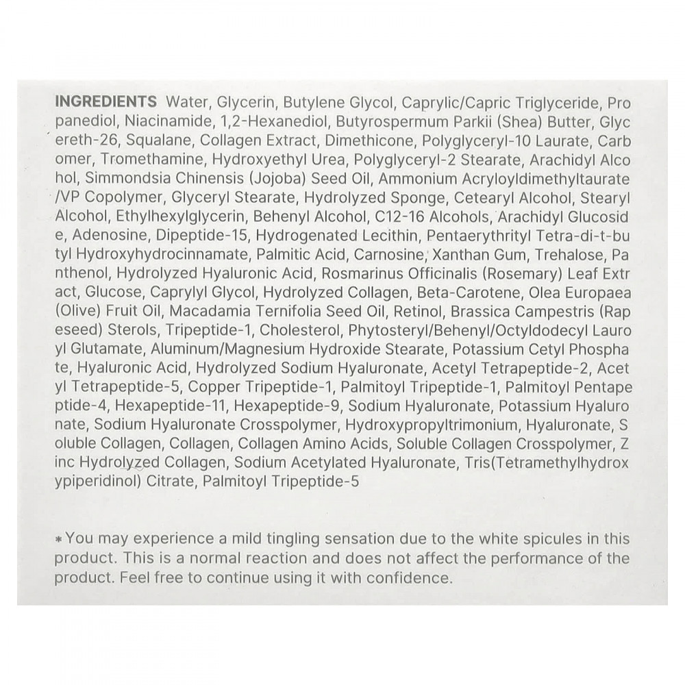 Вода, глицерин, бутиленгликоль, каприловый/каприновый триглицерид, пропандиол, никотинамид, 1,2-гександиол, масло ши (Butyrospermum parkii), глицерет-26, сквалан, экстракт коллагена, диметикон, полиглицерил-10 лаурат, карбомер, трометамин, гидроксиэтилированная мочевина, полиглицерил-2 стеарат, арахидиловый спирт, масло из семян жожоба (Simmondsia chinensis), аммоний акрилоилдиметилтаурат/ВП сополимер, глицерил стеарат, гидролизованная губка, цетеариловый спирт, стеариловый спирт, этилгексилглицерин, бегениловый спирт, c12-16 спирты, арахидиловый глюкозид, аденозин, дипептид-15, гидрогенизированный лецитин, пентаэритритил тетра-ди-трет-бутил гидроксигидроциннамат, пальмитиновая кислота, карнозина, ксантановая камедь, трегалоза, пантенол, гидролизованная гиалуроновая кислота, экстракт листьев розмарина (Rosmarinus officinalis), глюкоза, каприлилгликоль, гидролизованный коллаген, бета-каротин, оливковое масло (Olea europaea), масло макадамии (Macadamia ternifolia), ретинол, рапсовые стеролы (Brassica campestris), трипептид-1, холестерина, фитостерил/бегенил/октилдодецил лауроил глутамат, стеарат гидроксида алюминия/магния, цетил фосфат калия, гиалуроновая кислота, гидролизованный гиалуронат натрия, ацетил тетрапептид-2, ацетил тетрапептид-5, меди трипептид-1, пальмитоил трипептид-1, пальмитоил пентапептид-4, гексапептид-11, гексапептид-9, гиалуронат натрия, гиалуронат калия, кроссполимер гиалуроната натрия, гидроксипропилтримоний, гиалуронат, растворимый коллаген, коллаген, коллагеновые аминокислоты, растворимый коллаген кроссполимер, гидролизованный цинком коллаген, ацетилированный гиалуронат натрия, трис(тетраметилгидроксипиперидинол) цитрат, пальмитоил трипептид-5.