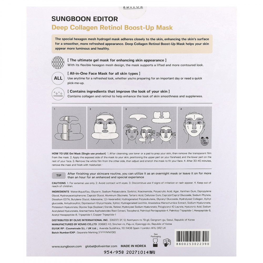 Специальная гидрогелевая маска с шестигранной сеткой плотно прилегает к коже, улучшая ее поверхность, делая ее более гладкой и свежей. Маска с глубоким коллагеном и ретинолом помогает вашей коже выглядеть более сияющей и здоровой.