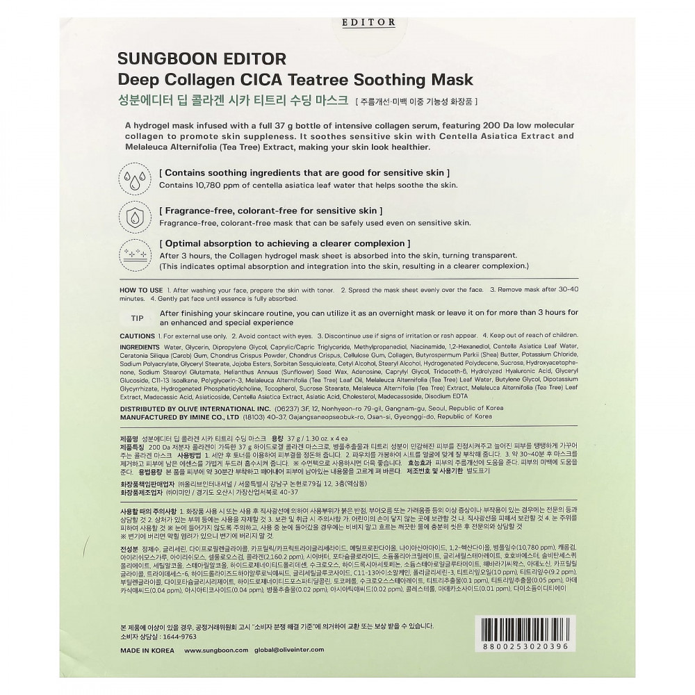 Гидрогелевая маска, наполненная полным флаконом 37 г интенсивной коллагеновой сыворотки, содержащей низкомолекулярный коллаген 200 Да для повышения эластичности кожи. Он успокаивает чувствительную кожу благодаря экстракту центеллы азиатской и экстракта чайного дерева (Melaleuca alternifolia), делая вашу кожу более здоровой.
