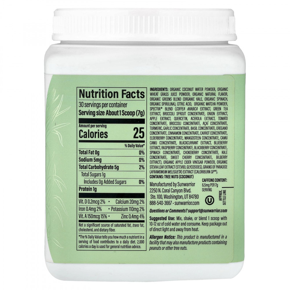 порошок из органической кокосовой воды, порошок из сока органических ростков пшеницы, органический натуральный ароматизатор, смесь органической зелени (органическая капуста, органический шпинат, органическая спирулина), лимонная кислота, порошок из органического матча, смесь spectra® (экстракт кофе арабика (Coffea arabica), экстракт зеленого чая, концентрат ростков брокколи, экстракт лука, экстракт яблока, кверцетин, экстракт ацеролы, концентрат томата, концентрат брокколи, концентрат ягод асаи, куркума, концентрат чеснока, концентрат базилика, концентрат орегано, концентрат корицы, концентрат моркови, концентрат бузины, концентрат мангостана, концентрат каму-каму, экстракт черной смородины, экстракт голубики, малиновый концентрат, концентрат ежевики, концентрат шпината, концентрат аронии, концентрат капусты, концентрат черешни, экстракт черники), порошок из органического яблочного уксуса, экстракт листьев органической стевии (стевиоловые гликозиды), экстракт африканского дерева (aframomum melegueta) (caloriburn GP®).