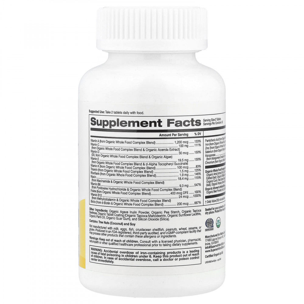 Поддержите свое здоровье с помощью нашего комплекса мультивитаминов из органических цельных продуктов для женщин старше 40 лет Super Nutrition®. Этот сертифицированный комплекс из органических цельных продуктов разработан специально для женщин старше 40 лет. Он сочетает в себе высокоэффективные незаменимые витамины, такие как A, C, D3 и B12, с мощной смесью органических растений и экстрактов, включая органический красный клевер, органическую свеклу и порошок из органической малины. Этот мультивитаминный комплекс премиального качества разработан для поддержки жизненного тонуса, энергии и общего здоровья с помощью полезных свойств цельных продуктов, растительных экстрактов и органических ингредиентов*.