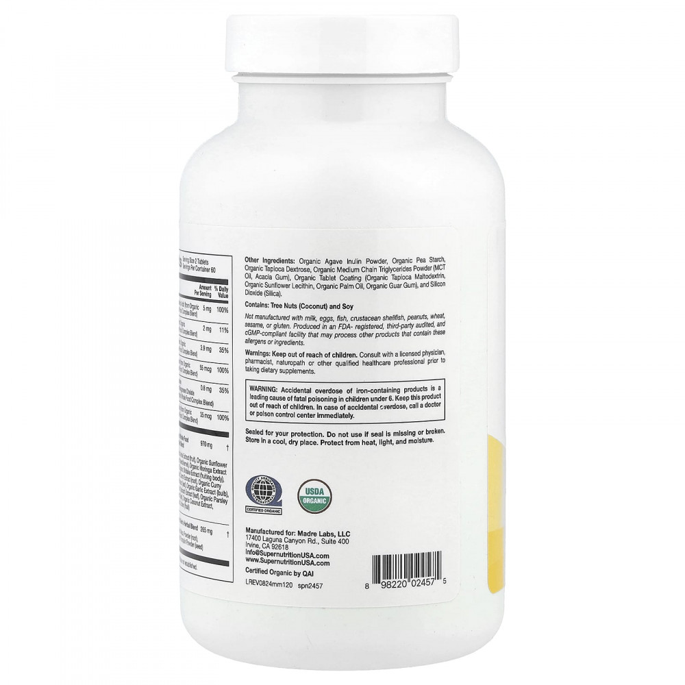 Порошок органического инулина агавы, Органический гороховый крахмал, Органическая тапиока декстроза, Порошок органических среднецепочечных триглицеридов (масло MCT, Акациевая камедь), Органическое покрытие для таблеток (органический тапиока, мальтодекстрин, Органический подсолнечный лецитин, Органическое пальмовое масло, Органическая гуаровая камедь), диоксид кремния.