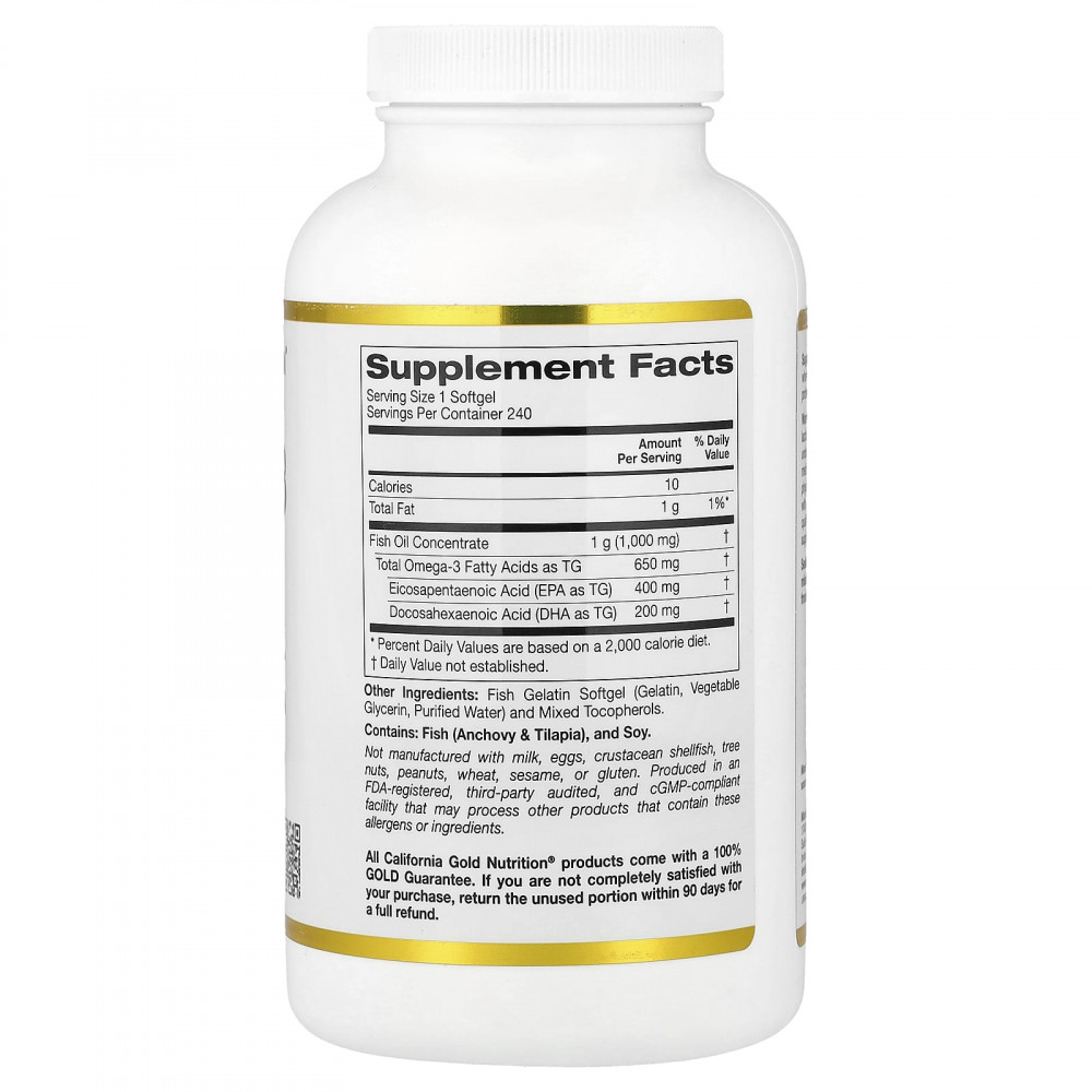 Рыбий жир с омега-3 от California Gold Nutrition® производится на основе концентрата рыбьего жира премиального качества и содержит ЭПК и ДГК в капсулах из рыбьего желатина.
