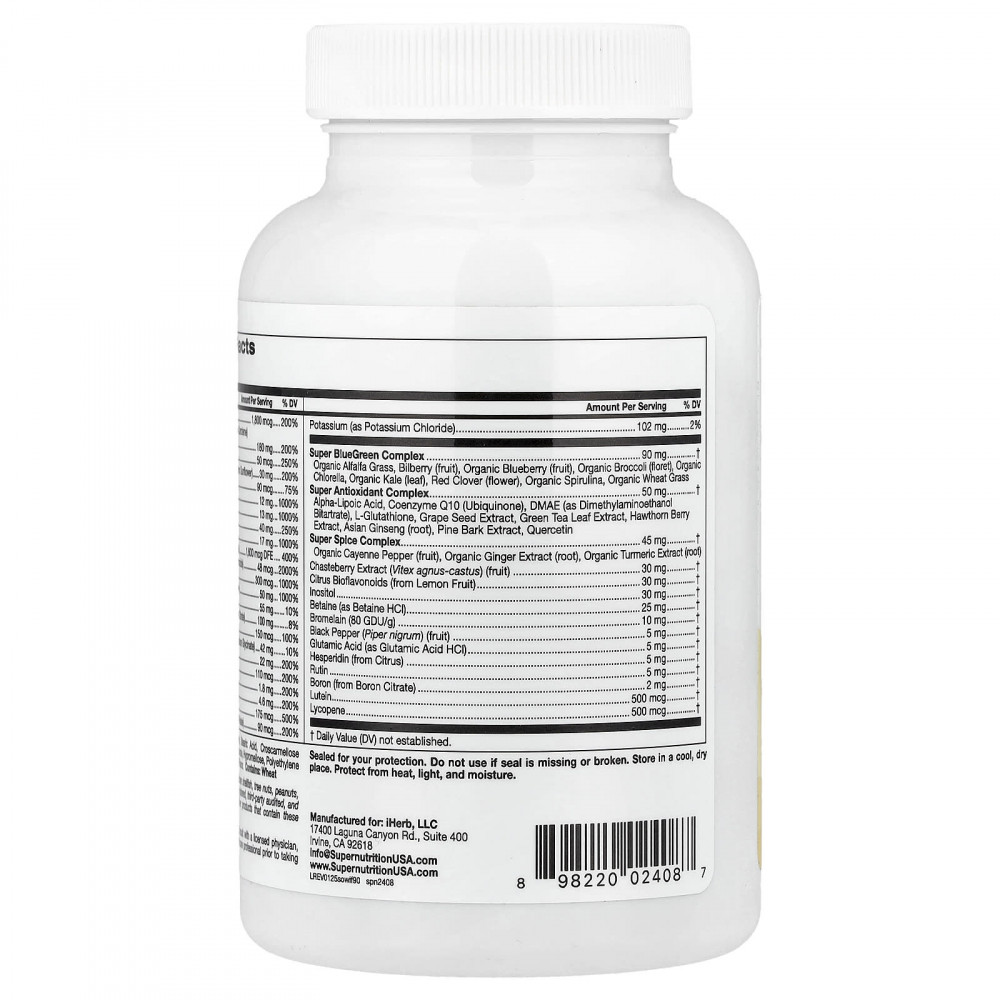 Витамин A (83% в виде ретинилпальмитата и 17% в виде бета-каротина), Витамин C (в виде аскорбиновой кислоты), витамин D (в виде витамина D3, холекальциферола), Витамин E (в виде d-альфа-токоферил сукцината из подсолнечника), витамин K (в виде витамина K1, фитонадиона), тиамин (в виде тиамина гидрохлорида), рибофлавин, ниацин (в виде никотиновой кислоты и никотинамида), витамин B6 (в виде пиридоксаль-5-фосфата), фолат (в виде 5-MTHF, L-5-метилтетрагидрофолата), витамин B12 (в виде метилкобаламина и дибенкозида), биотин (в виде d-биотина), пантотеновая кислота (в виде d-пантотената кальция), холин (в виде битартрата холина), Кальций (в виде карбоната кальция и цитрата кальция), Йод (из бурых водорослей), магний (в виде оксида магния и глицината магния), цинк (в виде цитрата цинка), селен (в виде селенита натрия), Медь (в виде глицината меди), Марганец (в виде сульфата марганца), Хром (в виде пиколината хрома), Молибден (в виде аминокислотного хелата молибдена), Калий (в виде хлорида калия), комплекс Super BlueGreen: органические ростки люцерны, ягоды черники, ягоды органической голубики, соцветия органической брокколи, органическая хлорелла, листья органической кудрявой капусты, Красный клевер (цветки), органическая спирулина, ростки органической пшеницы; комплекс Super Antioxidant (антиоксиданты): альфа-липоевая кислота, Коэнзим Q10 (убихинон), ДМАЭ (в виде битартрата диметиламиноэтанола), L-глутатион, экстракт виноградных косточек, Экстракт листьев зеленого чая, экстракт ягод боярышника, корень женьшеня азиатского, экстракт сосновой коры, кверцетин; Комплекс суперспеций: плоды органического кайенского перца, экстракт корня органического имбиря, экстракт органической куркумы (корень); Экстракт плодов витекса (Vitex agnus-castus), цитрусовые биофлавоноиды (из плодов лимона), Инозитол, бетаин (в виде гидрохлорида бетаина), бромелаин (80 GDU/г), Плоды черного перца (Piper nigrum), глутаминовая кислота (в виде гидрохлорида глутаминовой кислоты), Гесперидин (из цитрусовых), рутин, Бор (из цитрата бора), лютеин, Ликопин