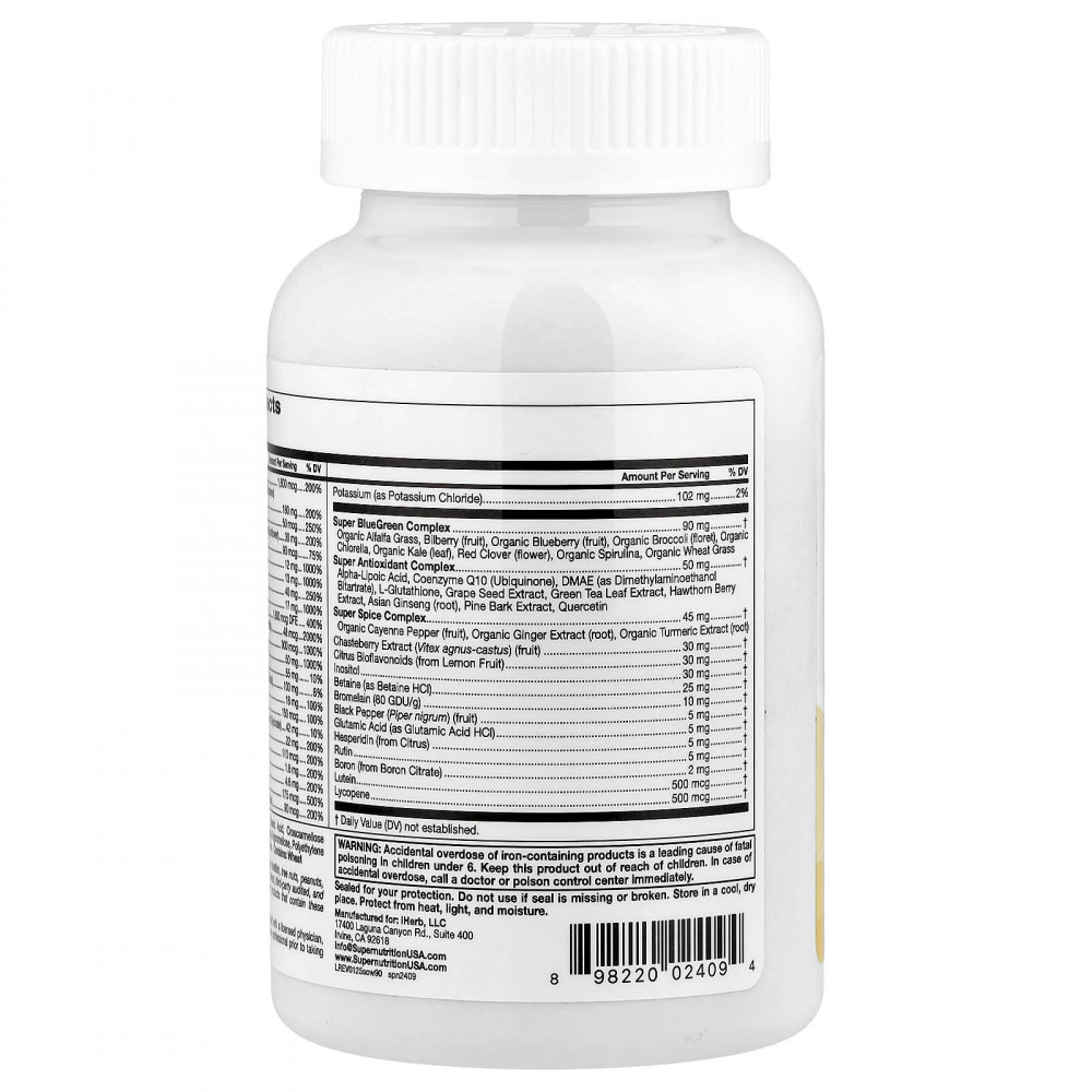 Витамин A (83% в виде ретинилпальмитата и 17% в виде бета-каротина), Витамин C (в виде аскорбиновой кислоты), витамин D (в виде витамина D3, холекальциферола), Витамин E (в виде d-альфа-токоферил сукцината из подсолнечника), витамин K (в виде витамина K1, фитонадиона), тиамин (в виде тиамина гидрохлорида), рибофлавин, ниацин (в виде никотиновой кислоты и никотинамида), витамин B6 (в виде пиридоксаль-5-фосфата), фолат (в виде 5-MTHF, L-5-метилтетрагидрофолата), Витамин B12 (в виде метилкобаламина и дибенкозида), Биотин (в виде d-биотина) Пантотеновая кислота (в виде d-пантотената кальция), Холин (в виде битартрата холина), кальций (в виде карбоната кальция и цитрата кальция), железо (в виде ферронилового железа), йод (из келпа), магний (в виде оксида магния и глицината магния), цинк (в виде цитрата цинка), селен (в виде селенита натрия), Медь (в виде глицината меди), Марганец (в виде сульфата марганца), Хром (в виде пиколината хрома), Молибден (в виде аминокислотного хелата молибдена), Калий (в виде хлорида калия), комплекс Super BlueGreen: органические ростки люцерны, ягоды черники, ягоды органической голубики, соцветия органической брокколи, органическая хлорелла, листья органической кудрявой капусты, Красный клевер (цветки), органическая спирулина, ростки органической пшеницы; комплекс Super Antioxidant (антиоксиданты): альфа-липоевая кислота, Коэнзим Q10 (убихинон), ДМАЭ (в виде битартрата диметиламиноэтанола), L-глутатион, экстракт виноградных косточек, Экстракт листьев зеленого чая, экстракт ягод боярышника, корень женьшеня азиатского, экстракт сосновой коры, кверцетин; Комплекс суперспеций: плоды органического кайенского перца, экстракт корня органического имбиря, экстракт органической куркумы (корень); Экстракт плодов витекса (Vitex agnus-castus), цитрусовые биофлавоноиды (из плодов лимона), Инозитол, бетаин (в виде гидрохлорида бетаина), бромелаин (80 GDU/г), Плоды черного перца (Piper nigrum), глутаминовая кислота (в виде гидрохлорида глутаминовой кислоты), Гесперидин (из цитрусовых), рутин, Бор (из цитрата бора), лютеин, Ликопин
