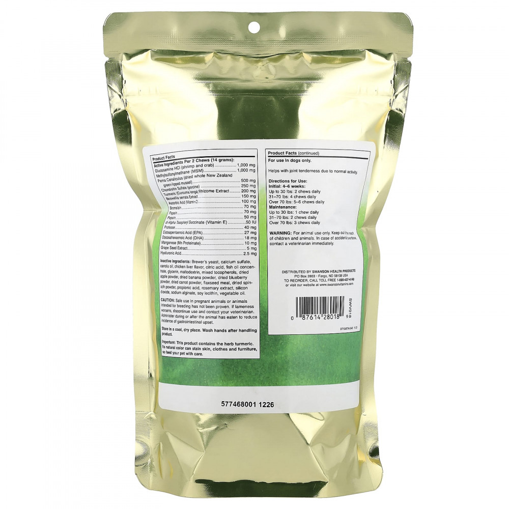Advanced Hip & Joint for Dogs от Swanson Pet Nutrition сочетает в себе питательные вещества для тканей суставов, такие как глюкозамин, хондроитин, МСМ, зеленогубую мидию и гиалуроновую кислоту с омега-3 жирными кислотами, антиоксидантами, ферментами и проверенными временем травами для здоровья суставов, такими как босвеллия и куркума. все в мягких жевательных таблетках со вкусом куриной печени.