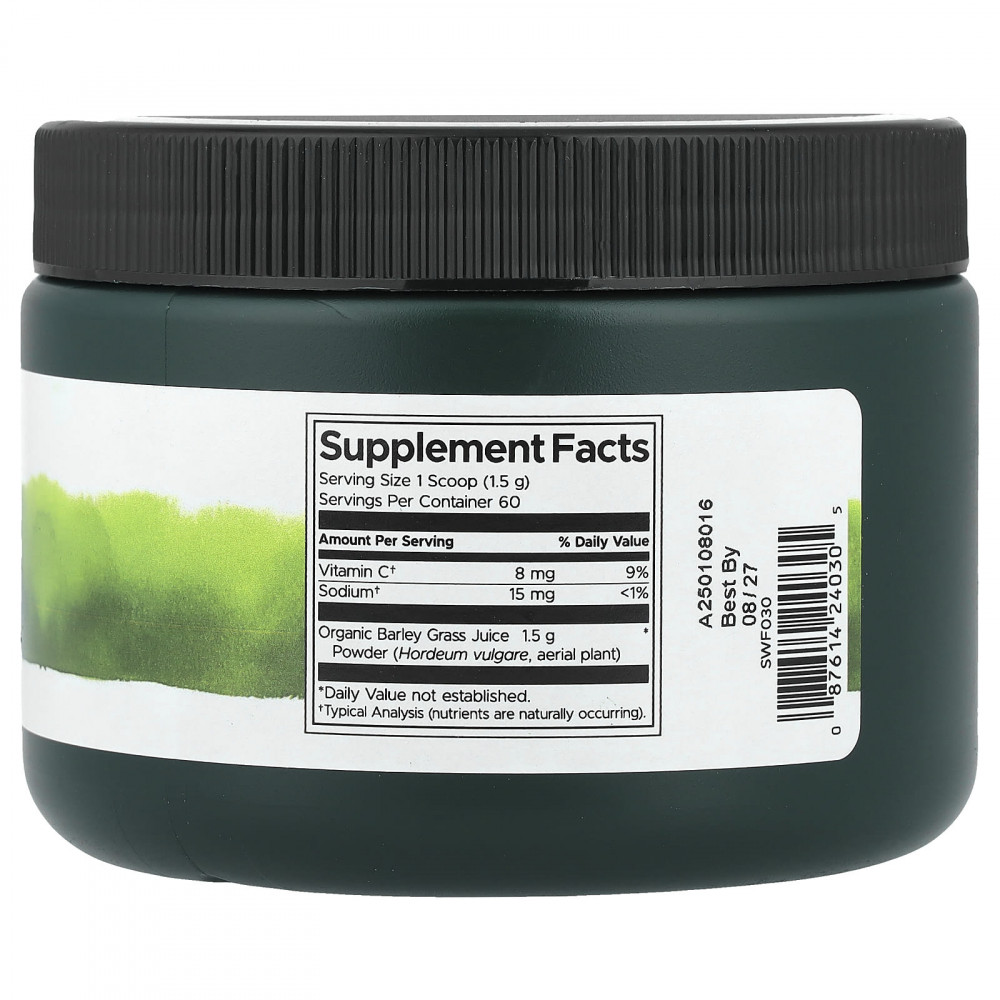 Ростки ячменя были одним из первых «суперфудов», завоевавших популярность. Они завоевали миллионы поклонников по всему миру. Сертифицированный Swanson порошок из сока органического ячменя является источником витаминов, минералов, аминокислот, хлорофилла и многого другого. Эта уникальная добавка изготавливается только из лучших сертифицированных органических молодых побегов ячменя. Сок концентрируется, высушивается и измельчается в сверхмелкий порошок, который легко смешивается с любой жидкостью. Для изготовления всего одного флакона порошка из сока ростков ячменя требуется почти 3 кг (7 фунтов) свежих листьев!