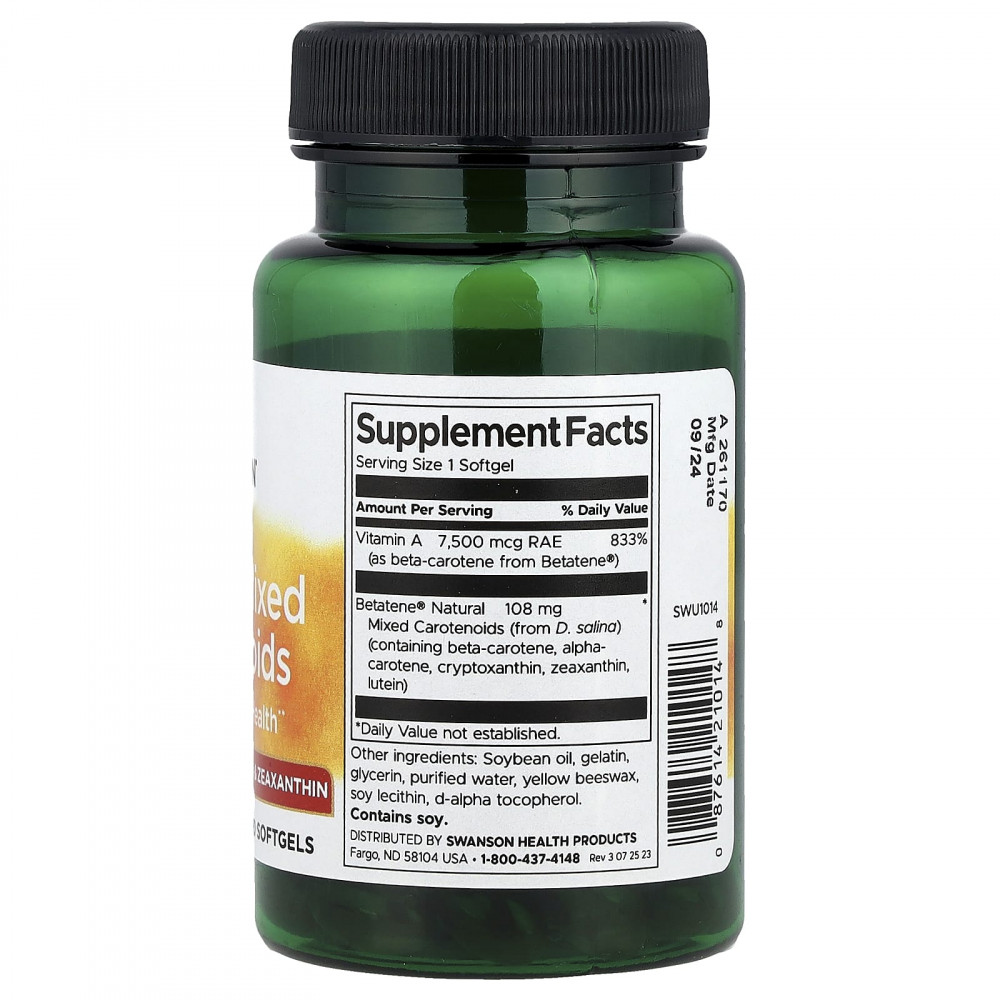Морские водоросли могут показаться не аппетитными, но они обеспечивают хорошее питание. Натуральные смешанные каротиноиды Betatene от Swanson Ultra - это запатентованная форма бета-каротина, полученная естественным образом из богатых питательными веществами морских водорослей. Это полноценный источник каротиноидов. Каждая капсула содержит витамин А, лютеин, зеаксантин и криптоксантин из водорослей D. Salina.